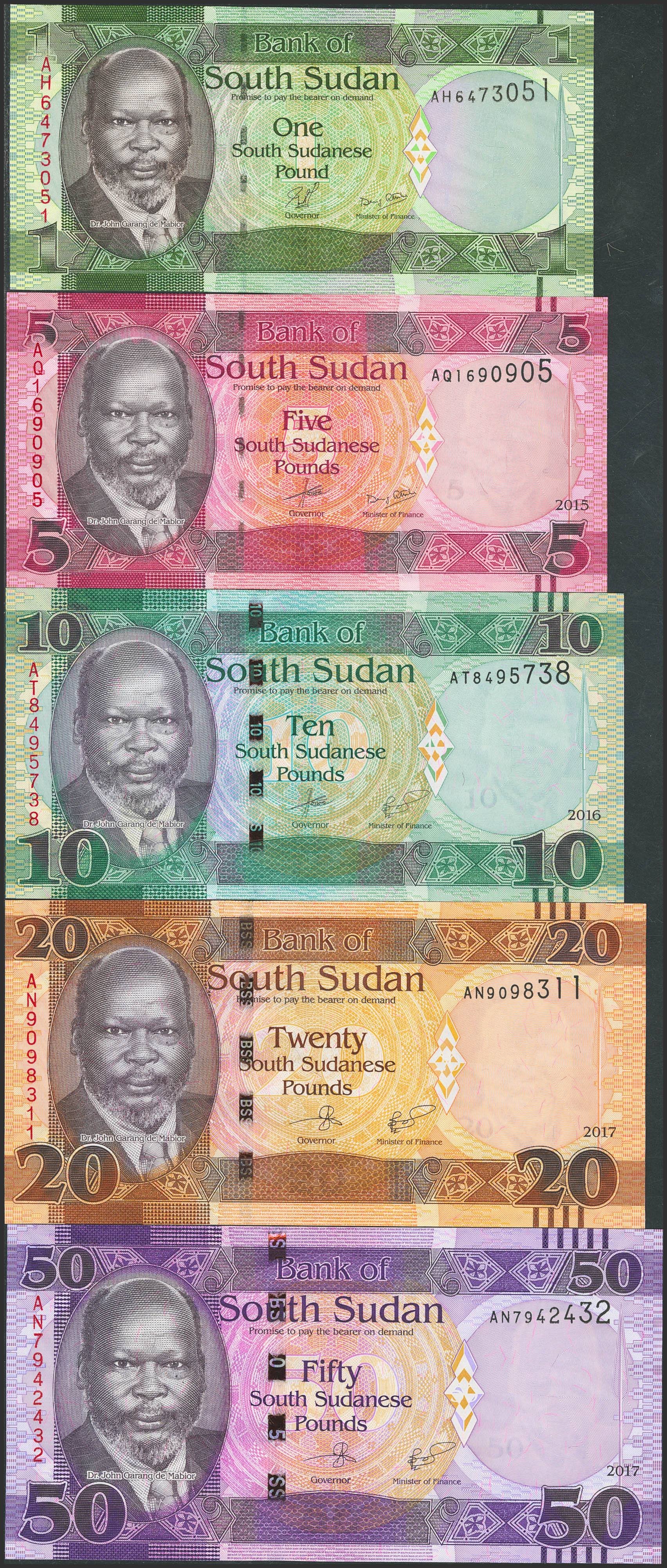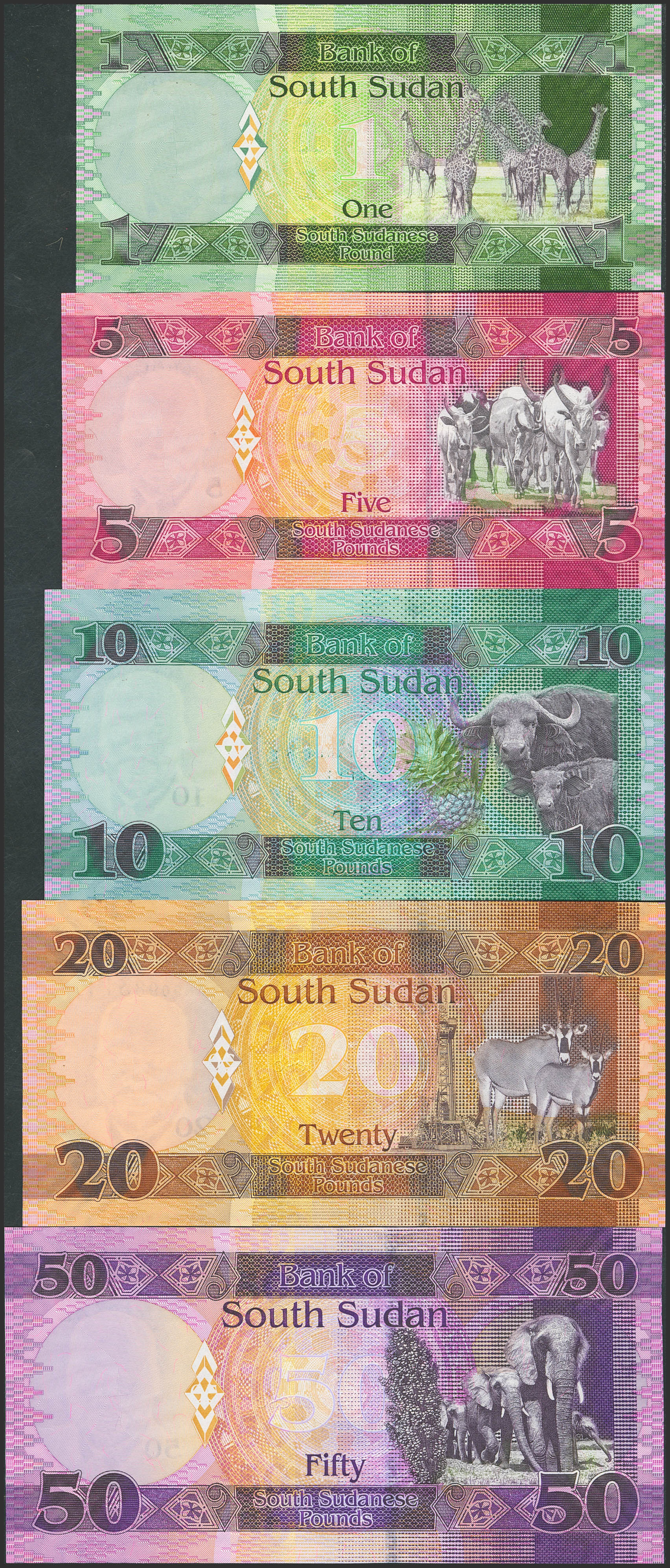 SOUTH SUDAN. Lot of 5 notes from 1 to 50 South Sudanese Pounds. 2011 to 2014. Bank of South Sudan. (Pick: 5, 11, 12b, 13c, 14c). Uncirculated.