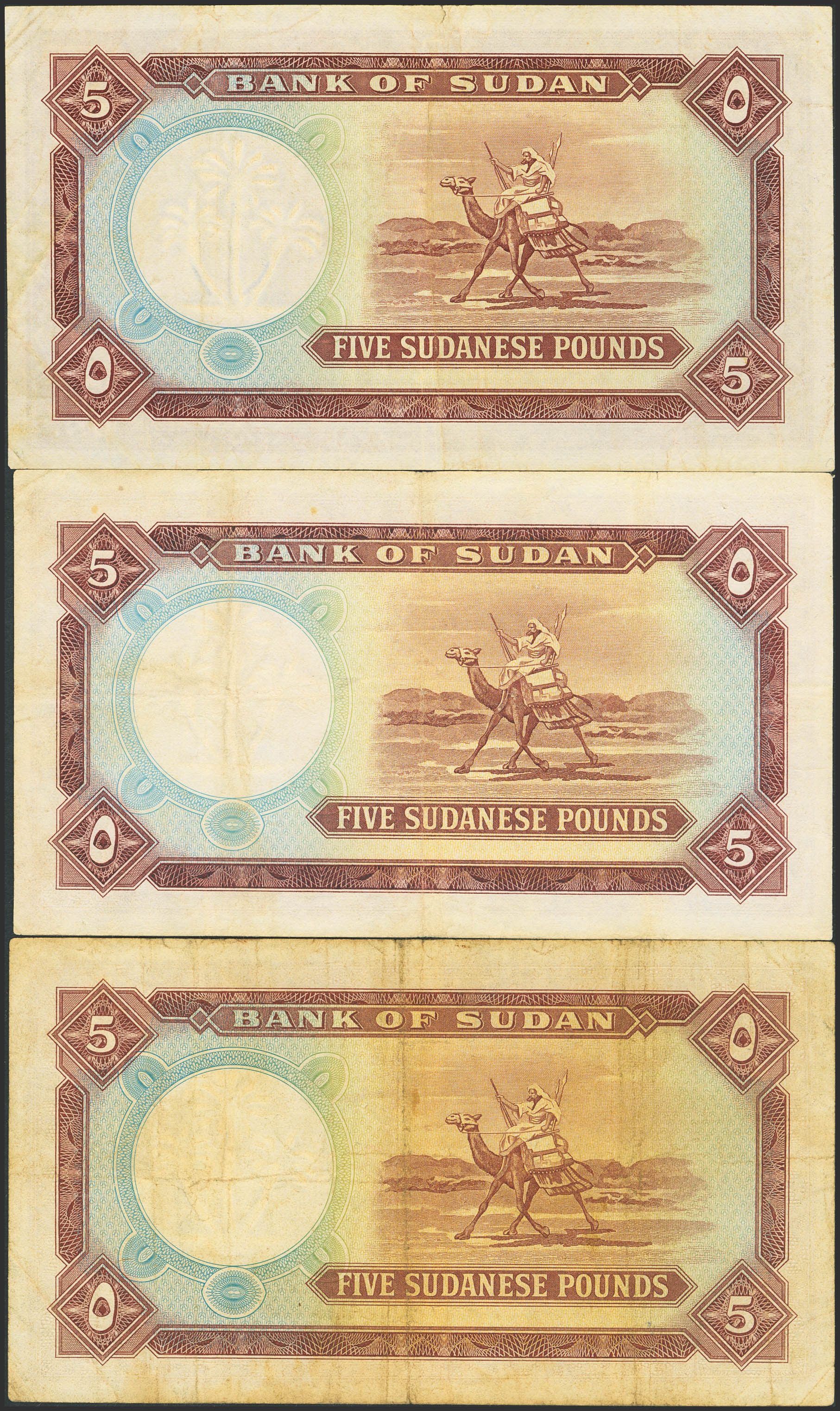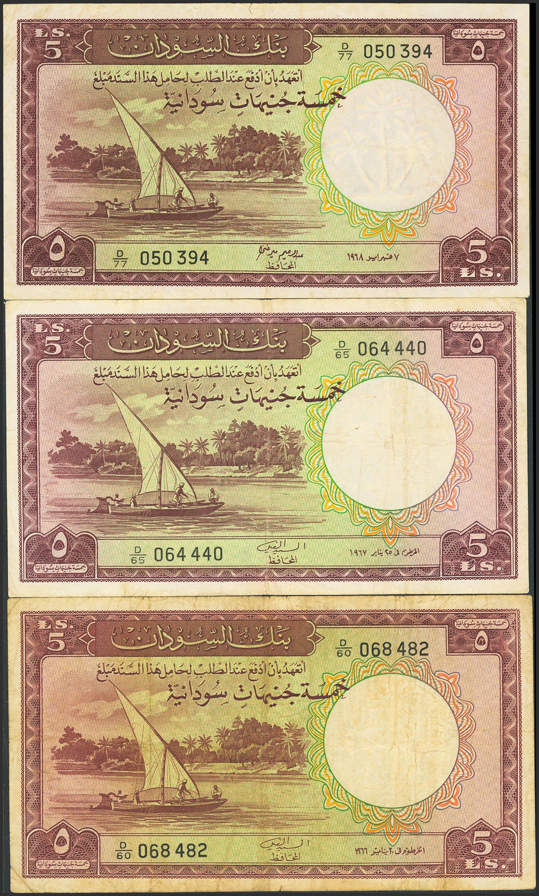 SUDAN. Lot of 3 notes of 5 Sudanese Pounds. 1966, 1967 and 1968. Bank of Sudan. (Pick: 9c, 9d, 9e). Very Fine(2) and Extremely Fine (1).