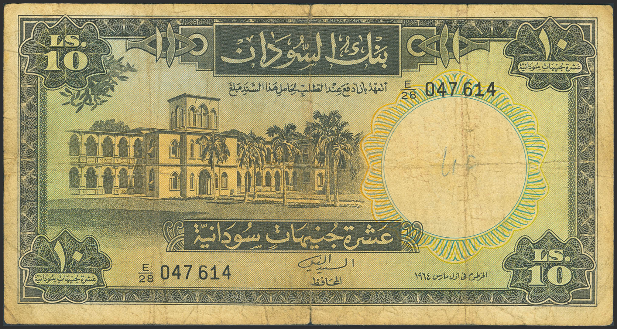 SUDAN. 10 Sudanese Pounds. 1964. Bank of Sudan. (Pick: 10a). Tears, pinhole. Fine.
