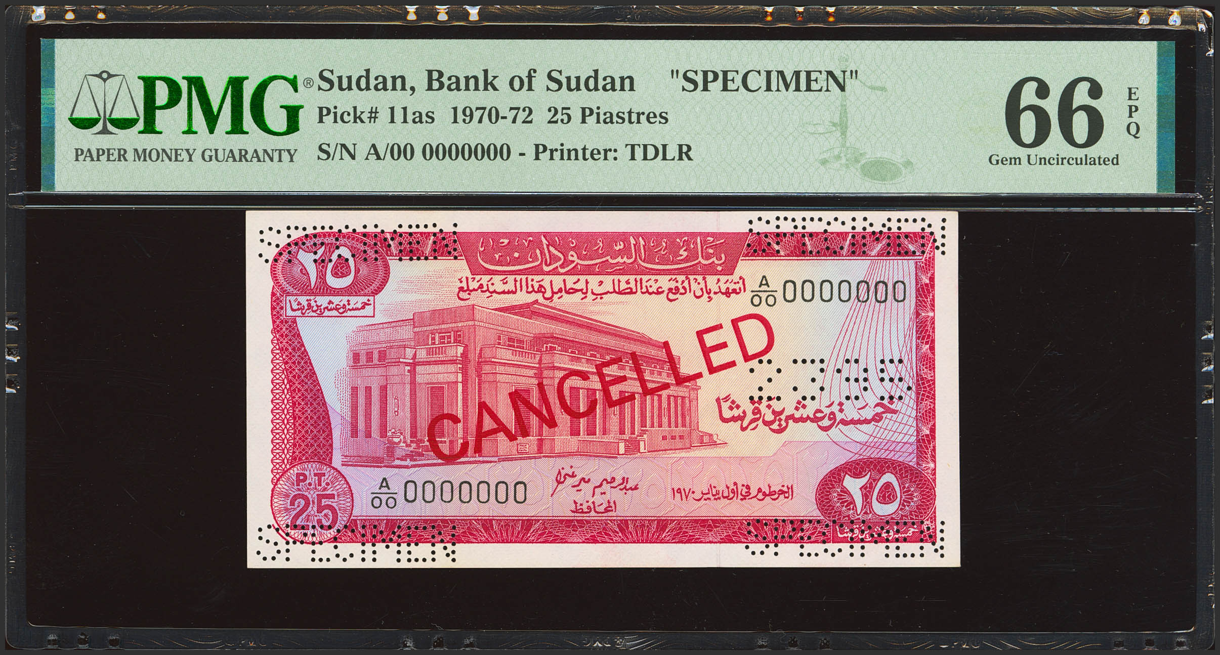 SUDAN. 25 Sudanese Pounds. 1970. Bank of Sudan. Specimen. (Pick: 11s). PMG66EPQ.