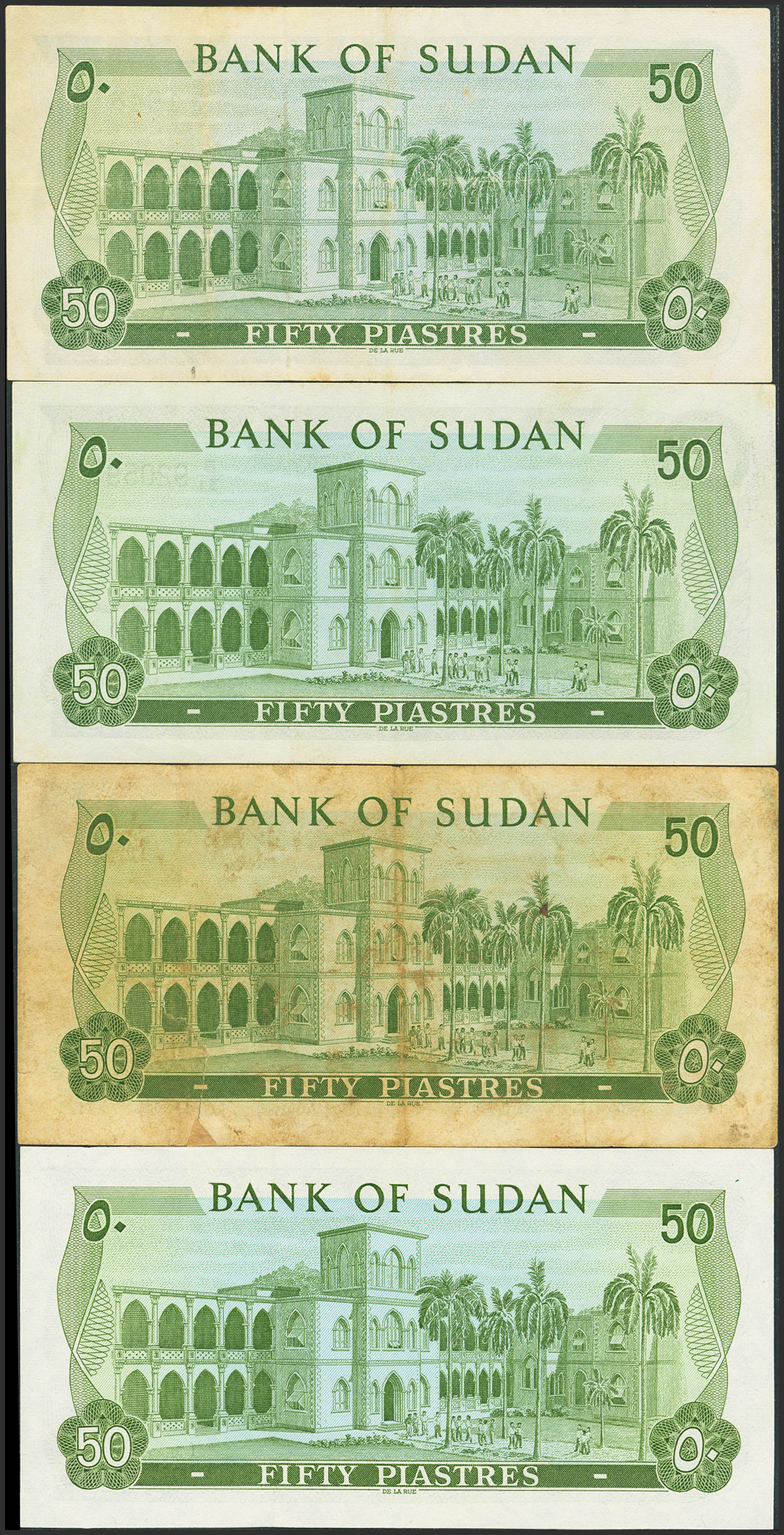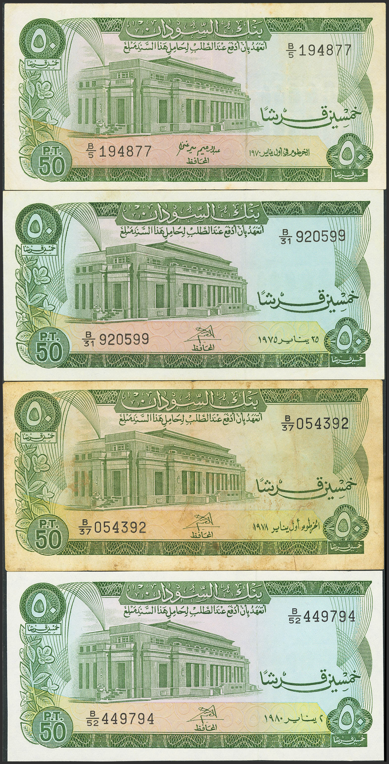 SUDAN. Lot of 4 notes of 50 Sudanese Pounds. 1970 to 1980. Bank of Sudan. (Pick: 12a, 12b, 12c). Very Fine with restored lower edge. More than Very Fine, Almost Uncirculated and Uncirculated.