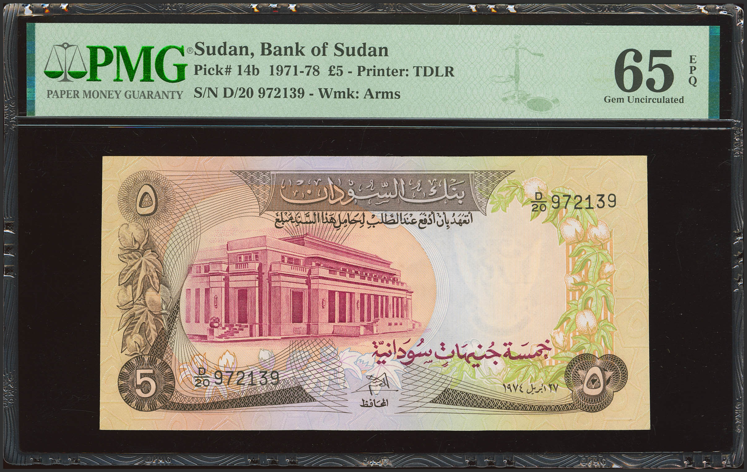 SUDAN. 5 Sudanese Pounds. 1974. Bank of Sudan. (Pick: 14b). PMG65EPQ.