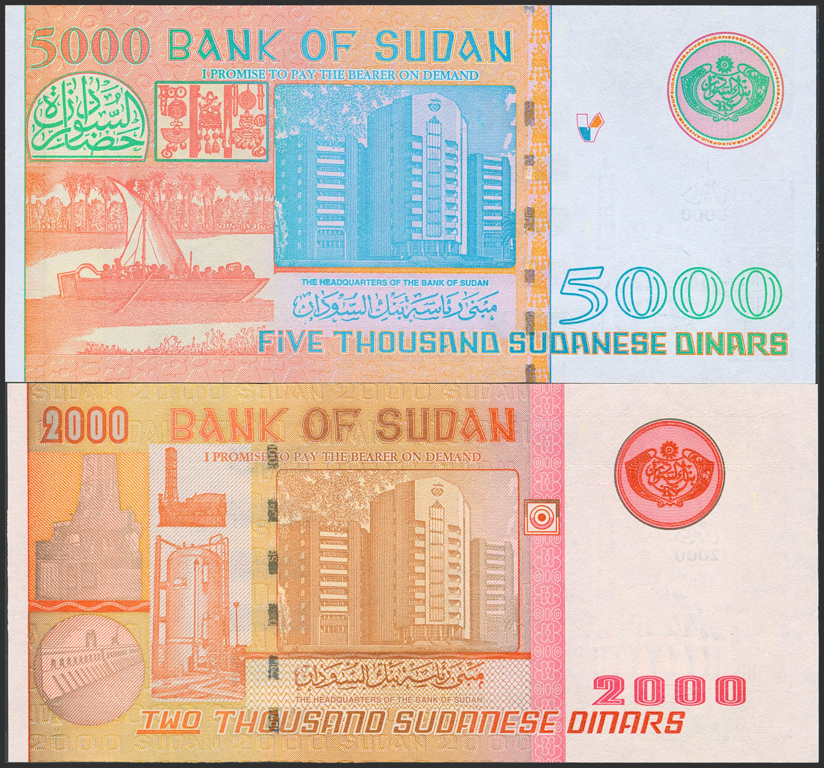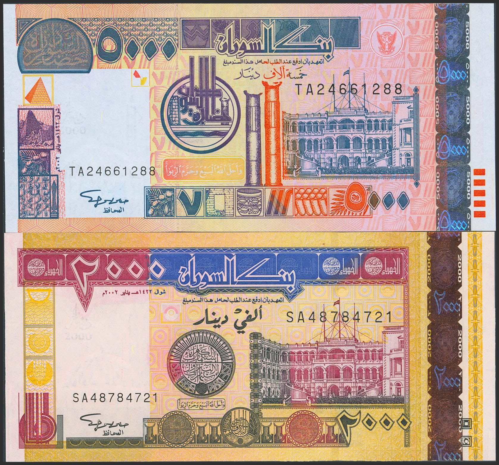 SUDAN. Lot of 2 notes of 2000 and 5000 Sudanese Dinars. 2002. Bank of Sudan. (Pick: 62a, 63a). Uncirculated.