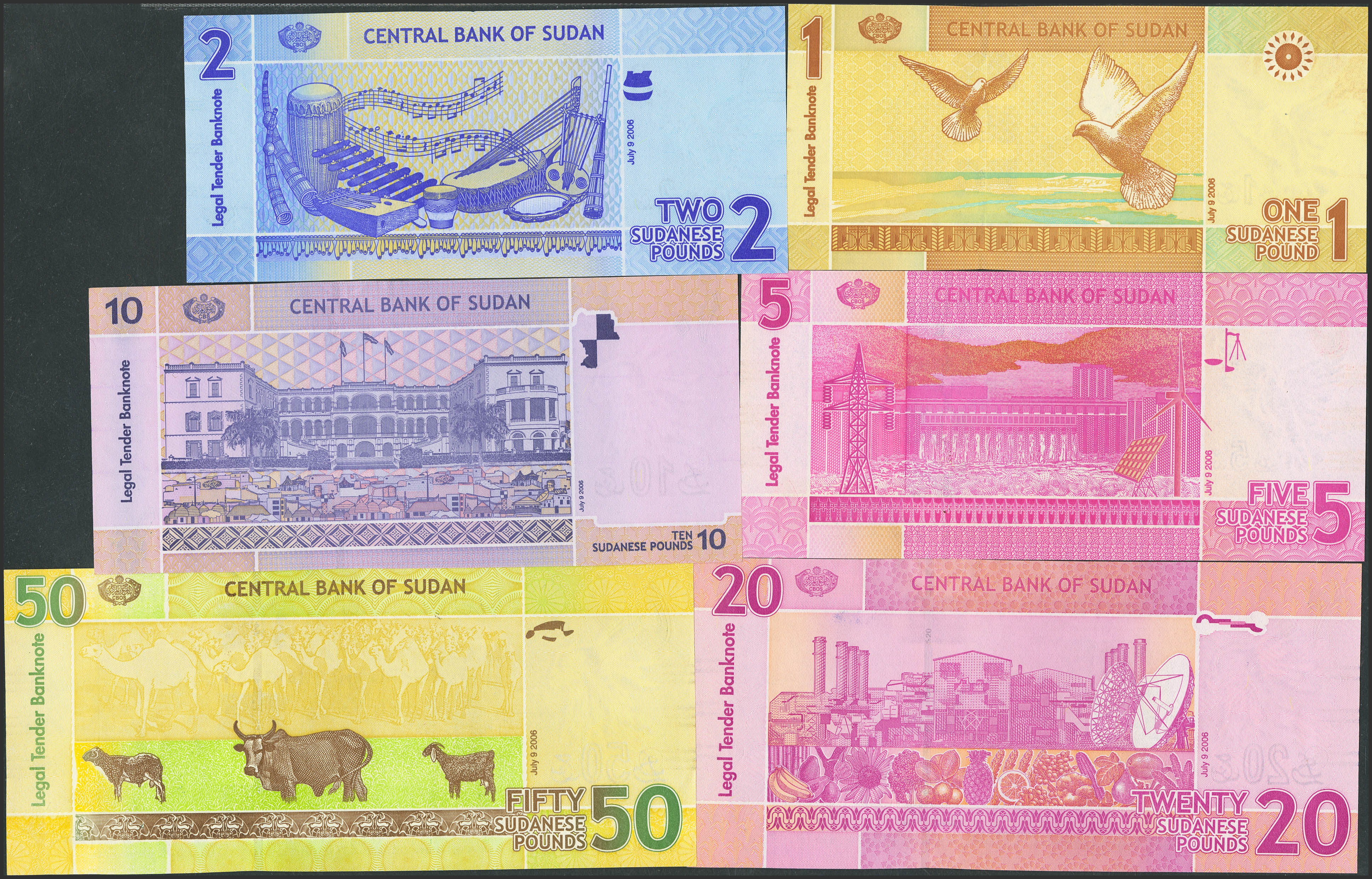 SUDAN. Complete set of 6 notes from 1 to 50 Pounds. 2006. Central Bank. (Pick: 64a, 65a, 66a, 67a, 68a, 69). Uncirculated.