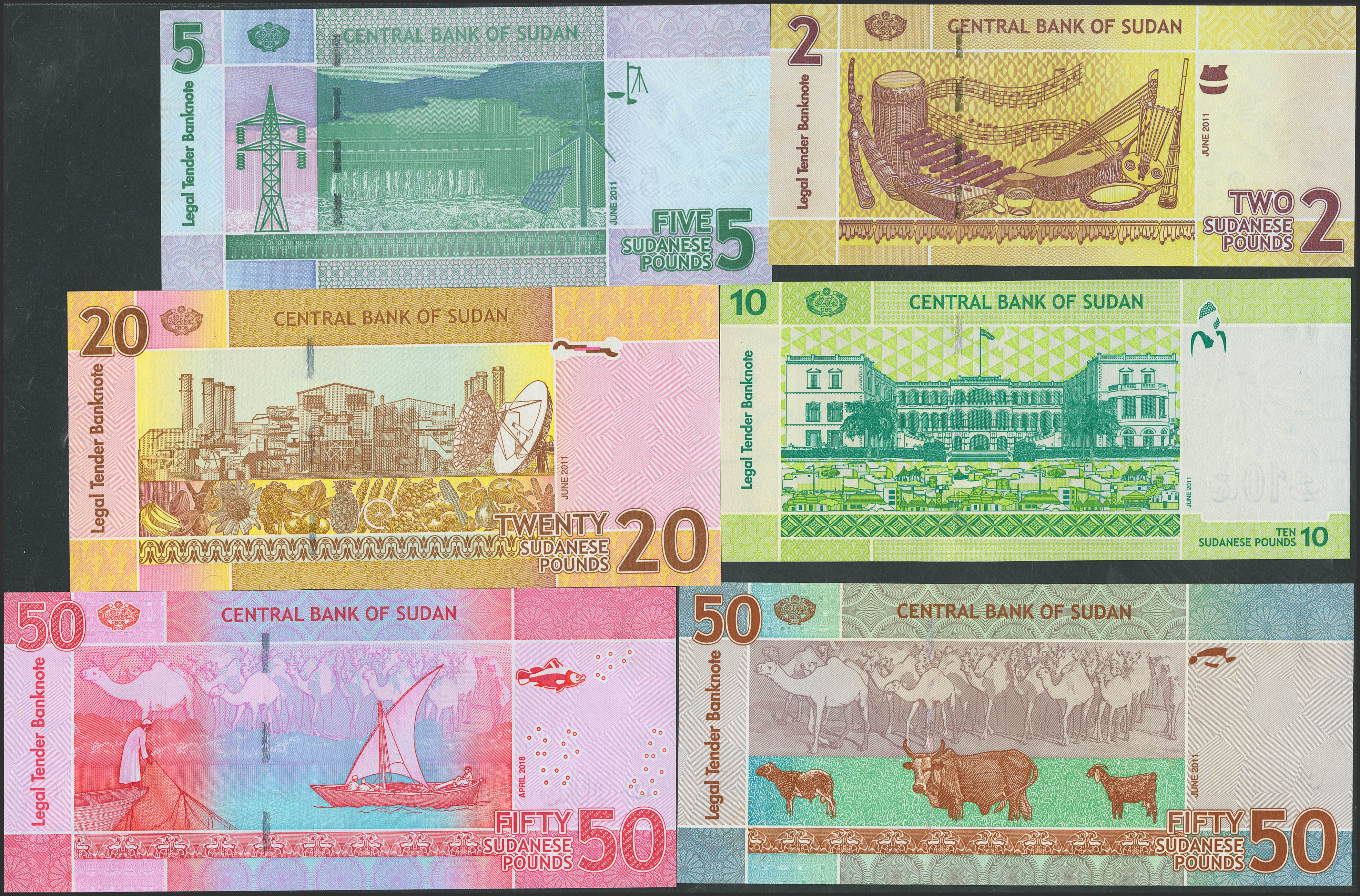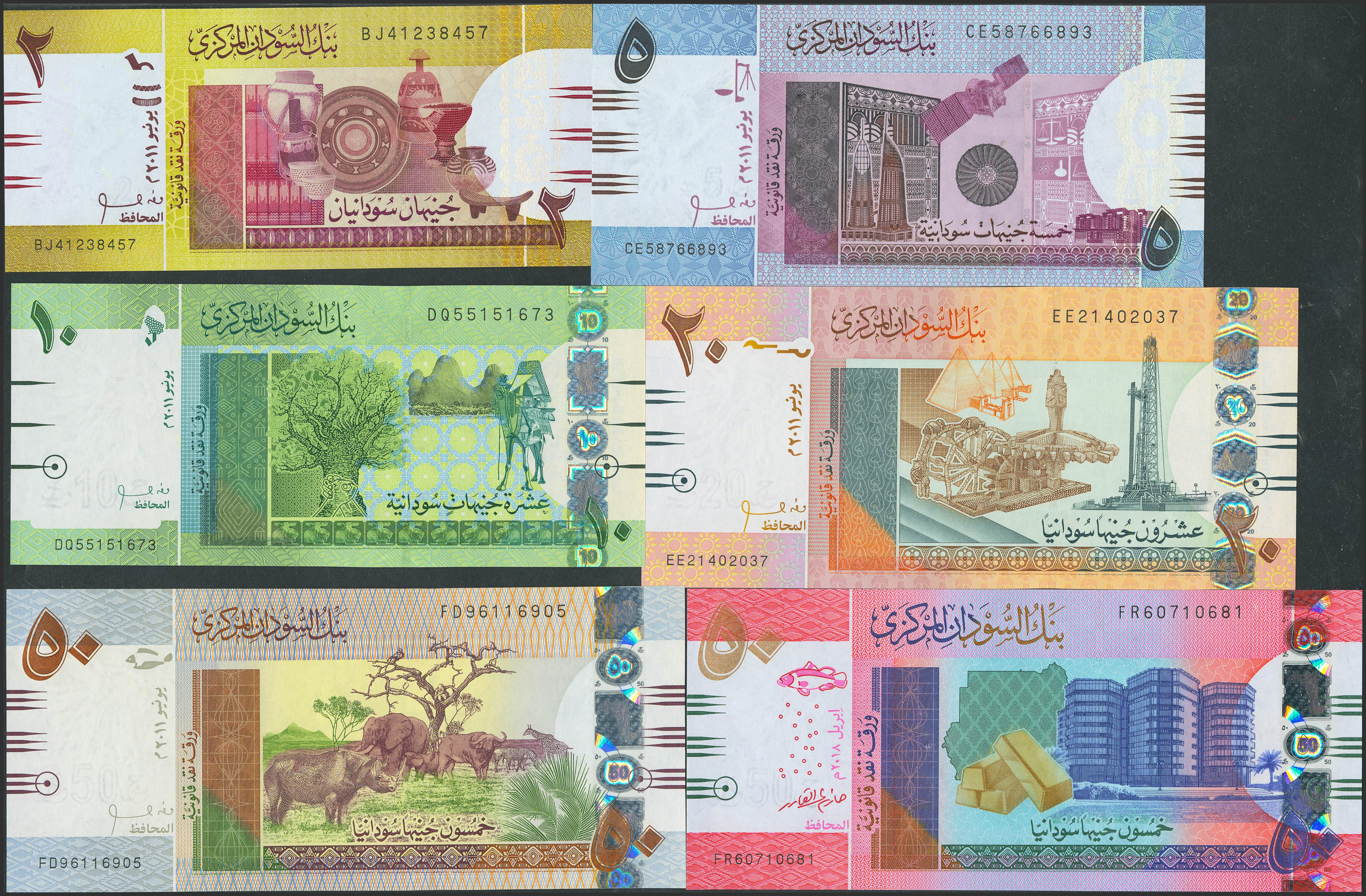 SUDAN. Lot of 6 notes from 2 to 50 Sudanese Pounds. 2011 and 2018. Central Bank. (Pick: 71a, 72a, 73a, 74a, 75a, 76). Uncirculated.