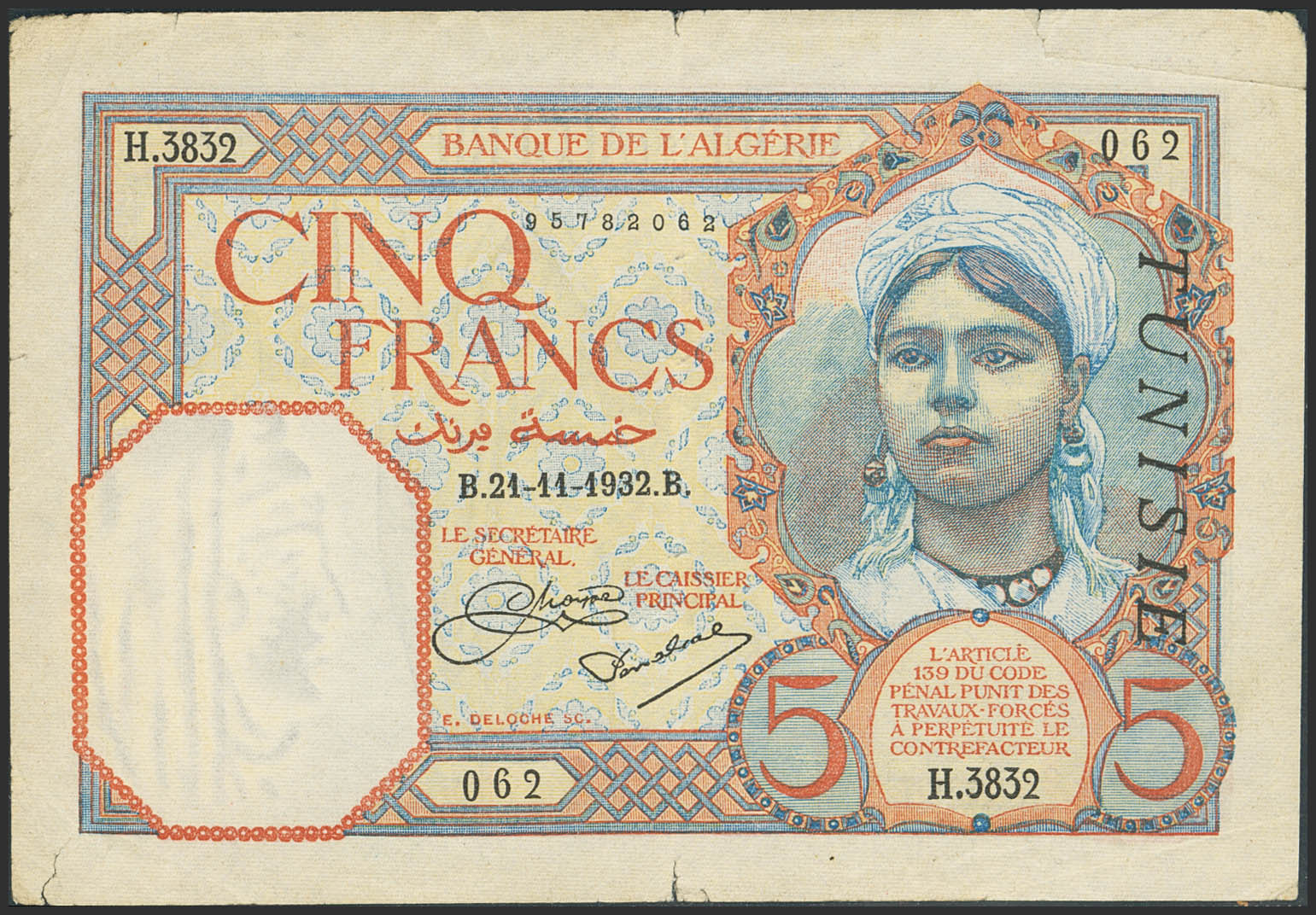 TUNISIA. 5 Francs. 21 November 1932. Banque de l'Algerie. Tunisie. (Pick: 8a). Washed, tears. More than Very Fine.