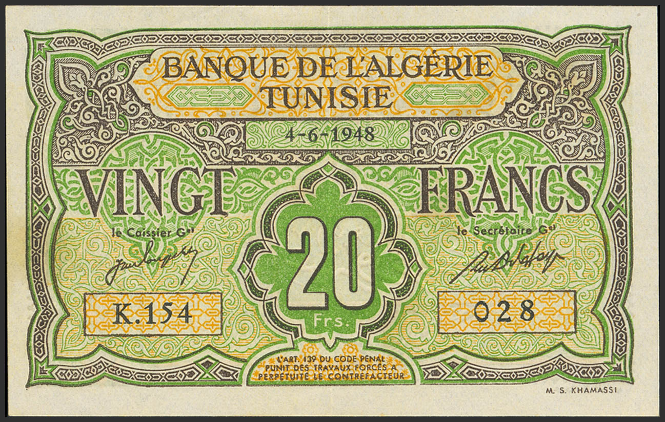 TUNISIA. 20 Francs. 4 June 1948. Banque de l'Algerie. Tunisie. (Pick: 22). Almost Uncirculated.