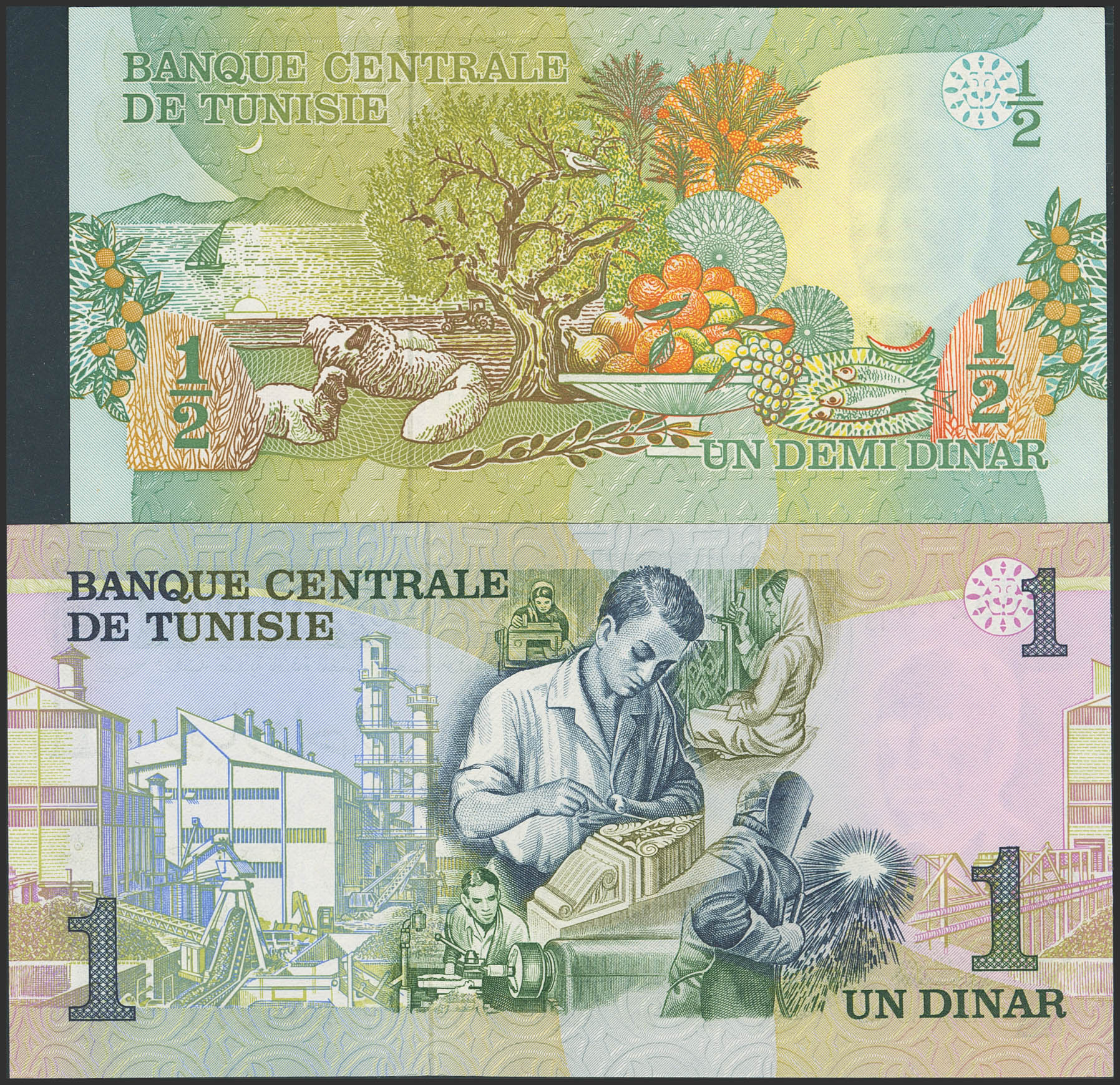 TUNISIA. Lot of 2 notes of ½ and 1 Dinar. 15 October 1973. Banque Centrale de Tunisie. (Pick: 69a, 70). Uncirculated.