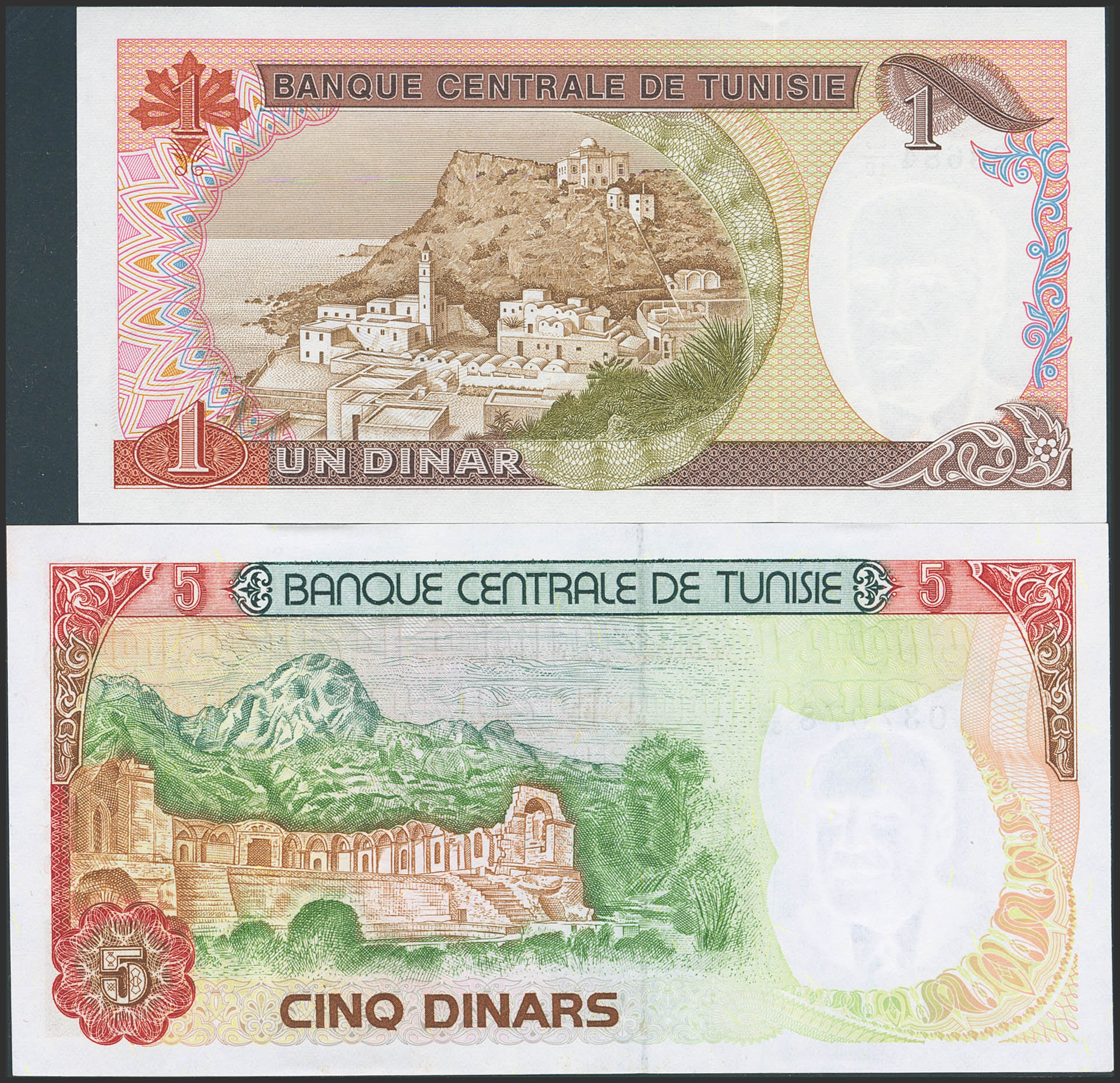 TUNISIA. Lot of 2 notes of 1 and 5 Dinars. 15 October 1980. Banque Centrale de Tunisie. (Pick: 74, 75). Uncirculated and Less than Uncirculated.