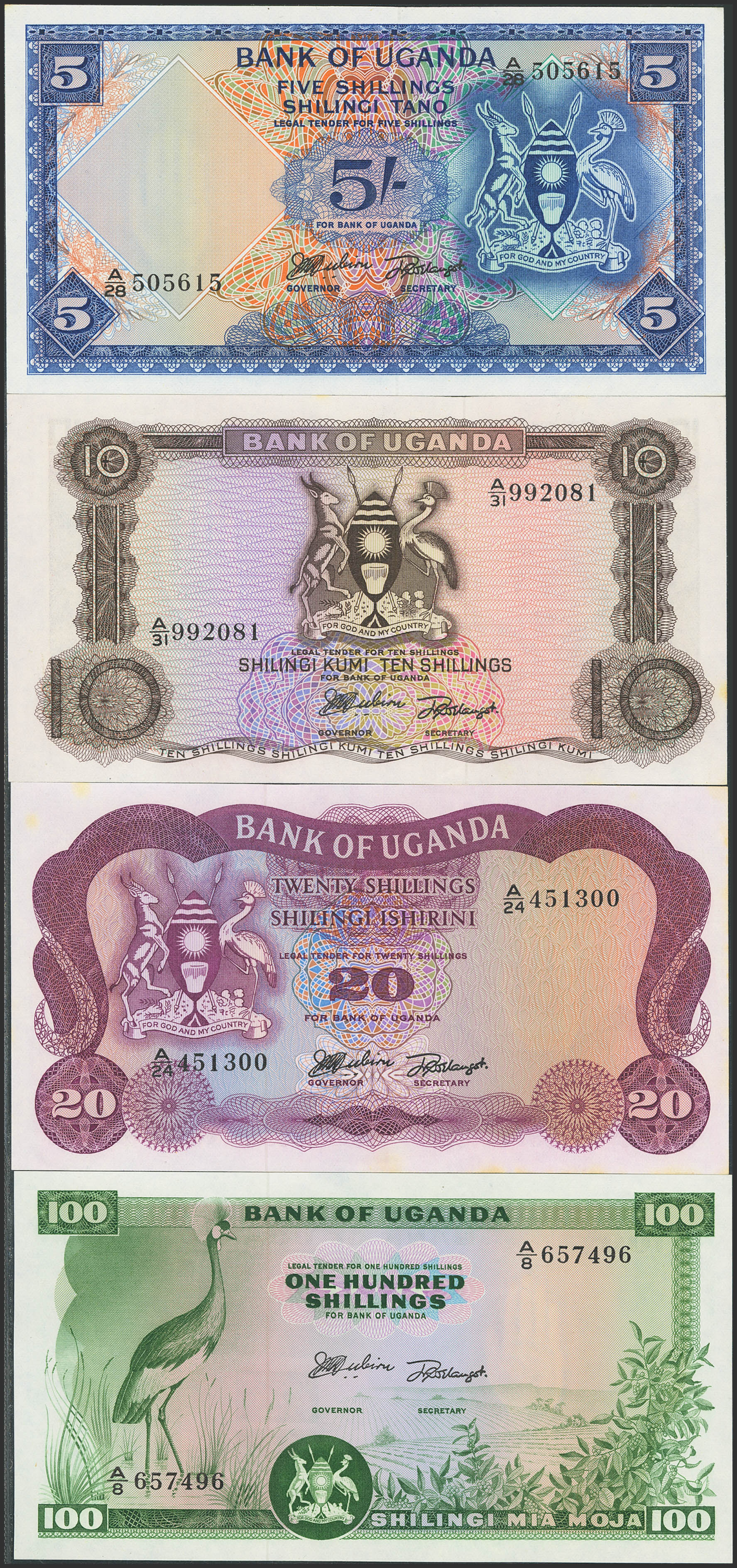 UGANDA. Lot 4 notes from 5 to 100 Shillings. (1966ca). Bank of Uganda. (Pick: 1, 2, 3, 5). Uncirculated (2) and Less than uncirculated (2).