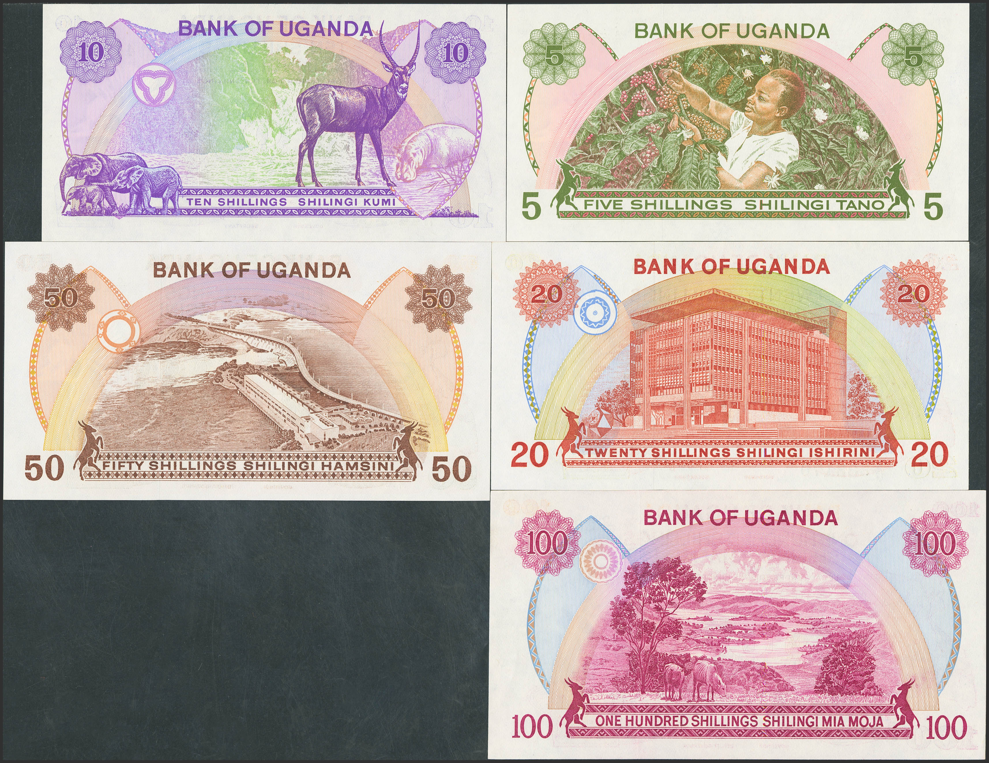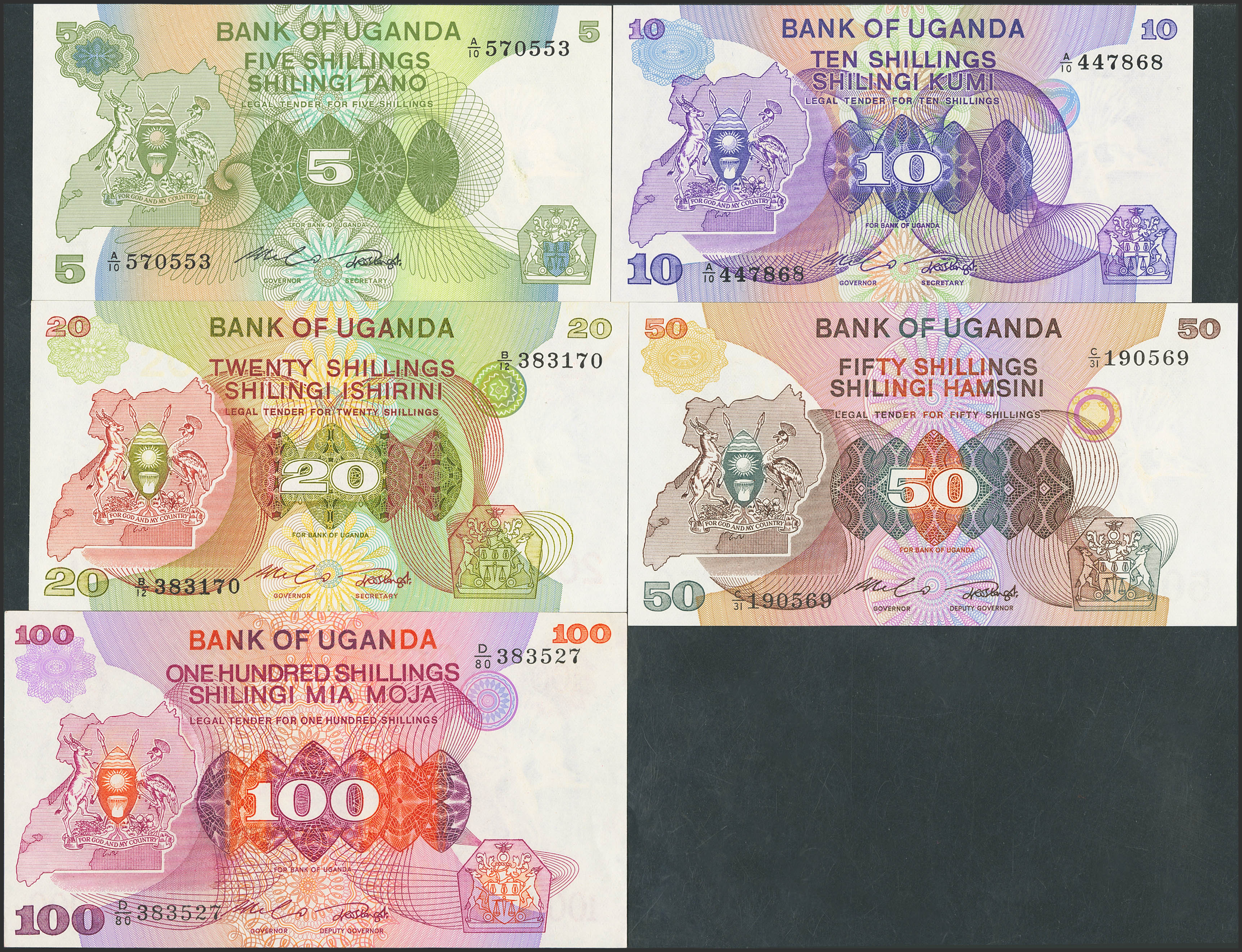 UGANDA. Complete set of 5 notes from 5 to 100 Shillings. (1982ca). Bank of Uganda. (Pick: 15, 16, 17, 18b, 19b). Uncirculated (4) and Less than Uncirculated (1).
