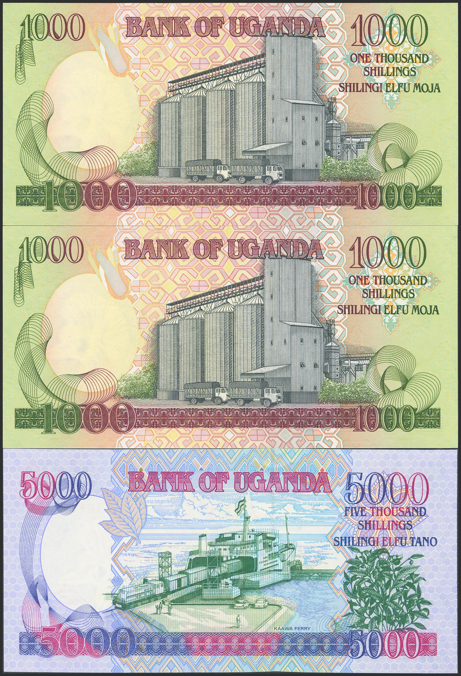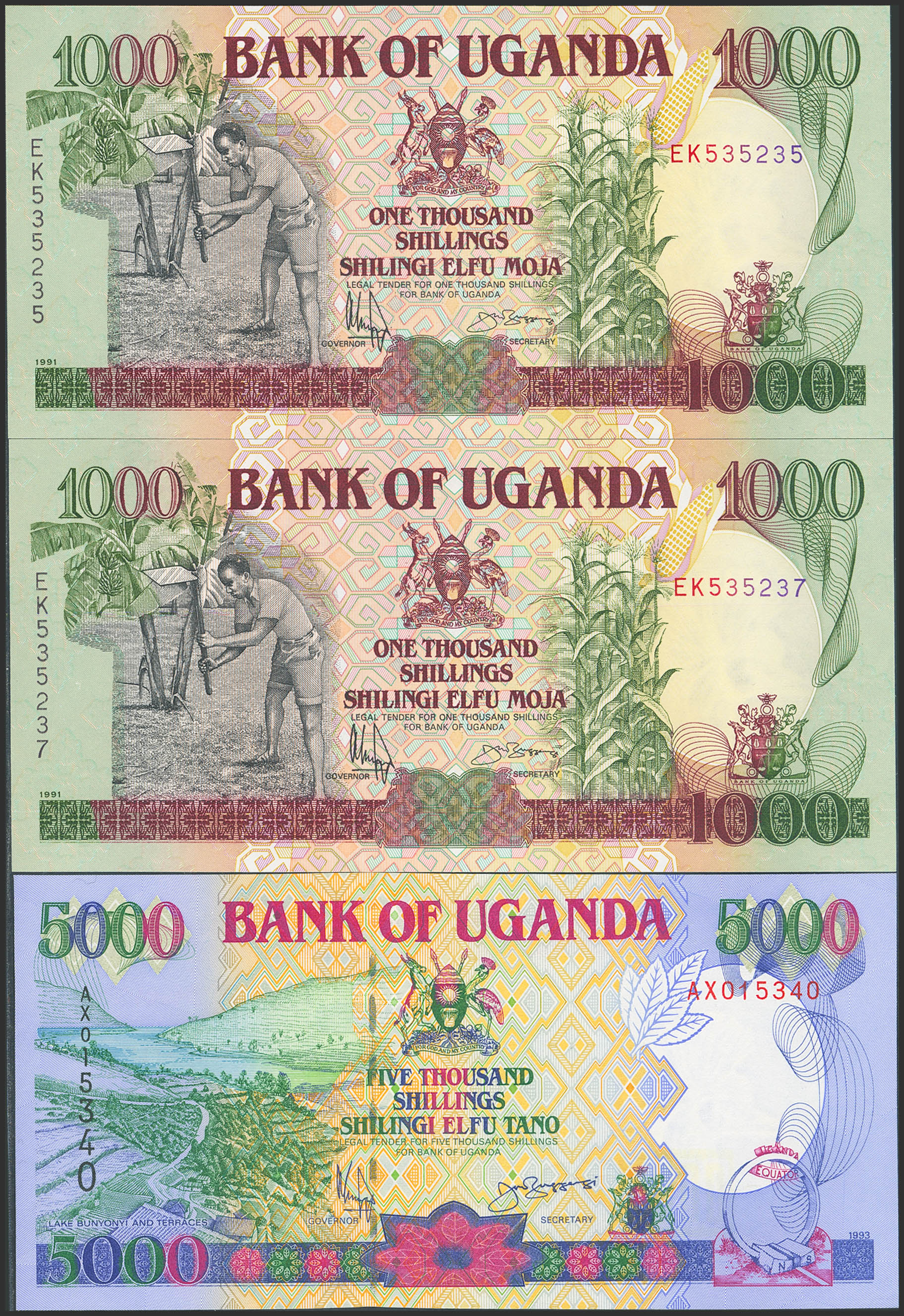 UGANDA. Lot of 3 notes of 1000 and 5000 Shillings. 1991 and 1993. Bank of Uganda. (Pick: 34b(2), 37a). Uncirculated.