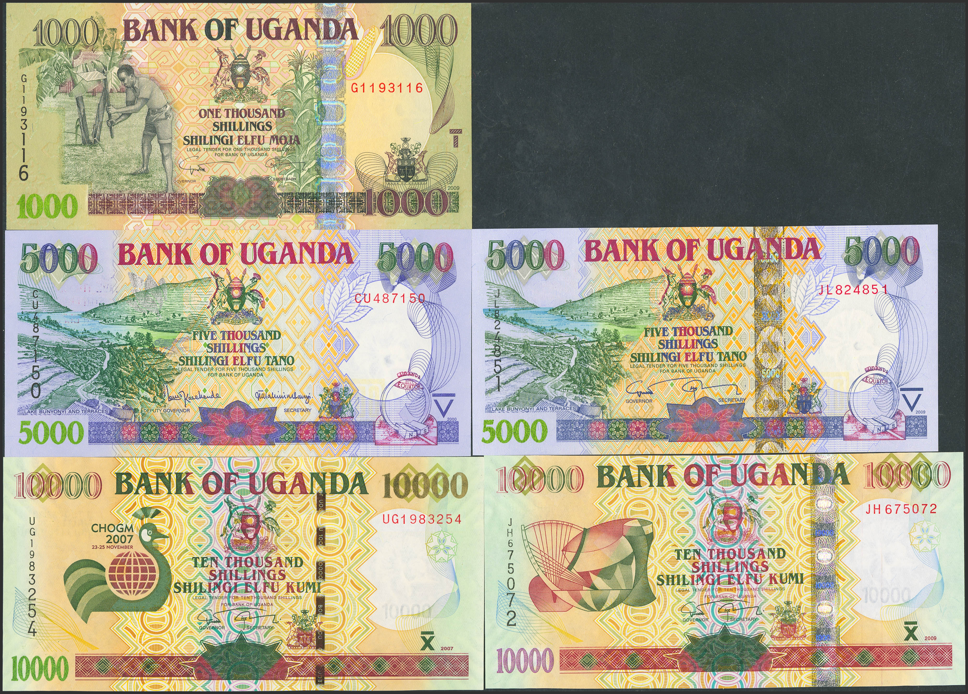 UGANDA. Lot of 5 notes of 1000, 5000 and 10000 Shillings. 2000 to 2009. Bank of Uganda. (Pick: 40a, 43d, 44d, 45c, 48). Uncirculated.