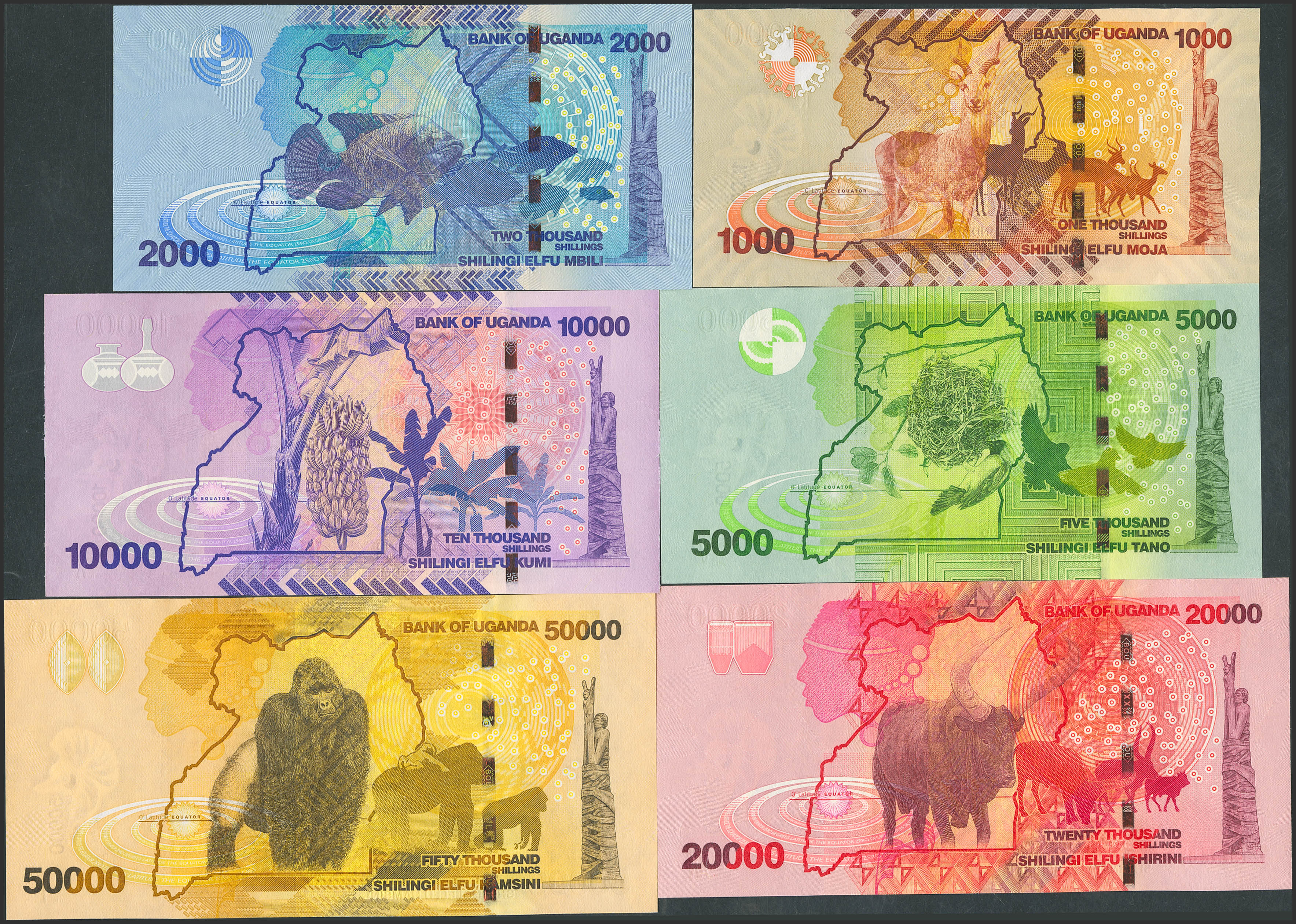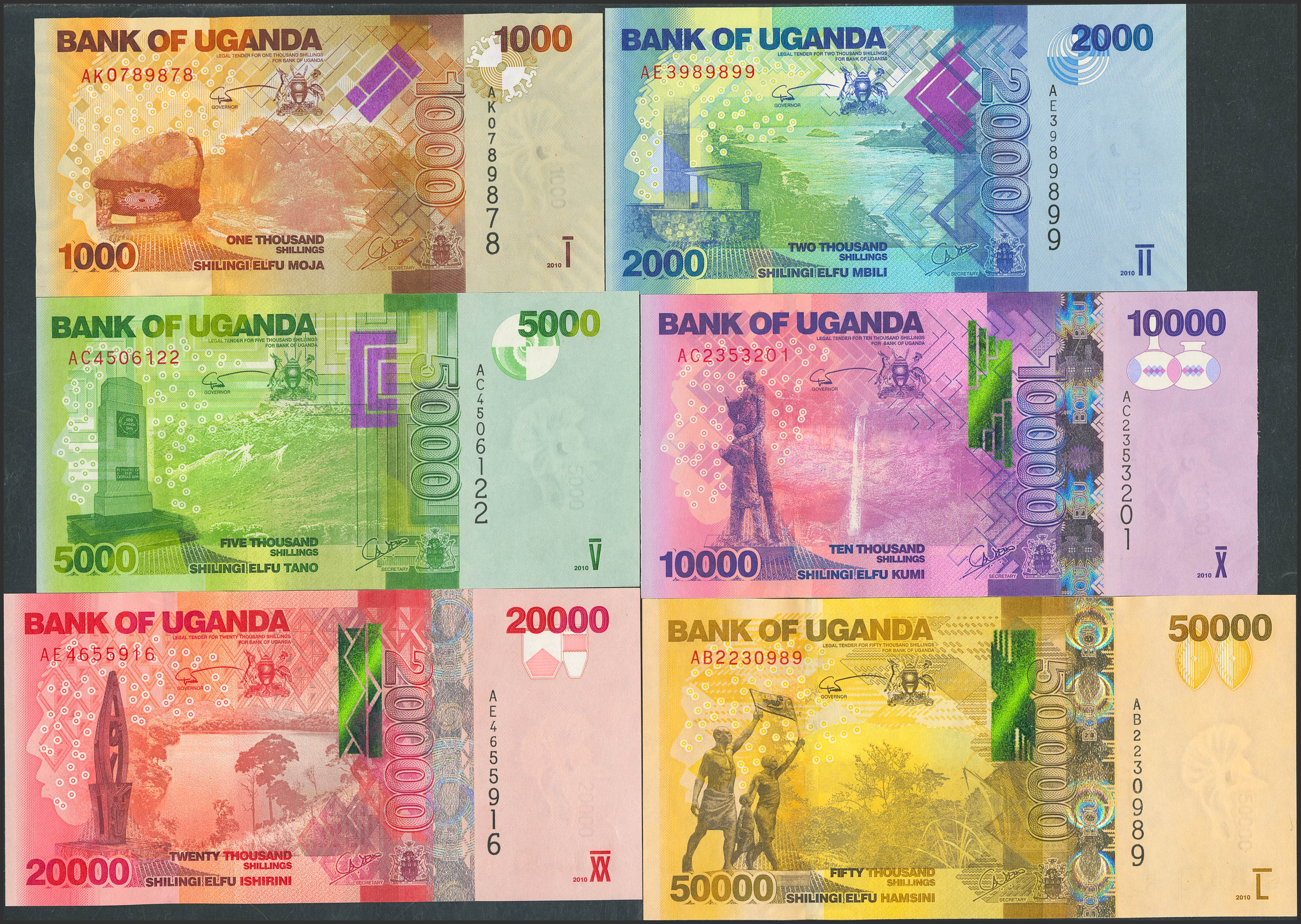 UGANDA. Complete set of 6 notes from 1000 to 50000 Shillings. 2010. Bank of Uganda. (Pick: 49a, 50a, 51a, 52a, 53a, 54a). Uncirculated.