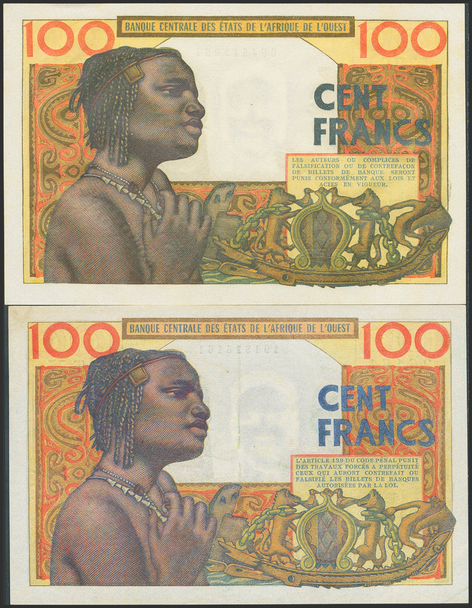 WEST AFRICAN STATES. Lot of 2 notes of 100 Francs. 1959 and not dated. Banque Centrale des Etats de l'Afrique de l'Ouest. (Pick: 2a, 2b). Almost Uncirculated and Uncirculated.