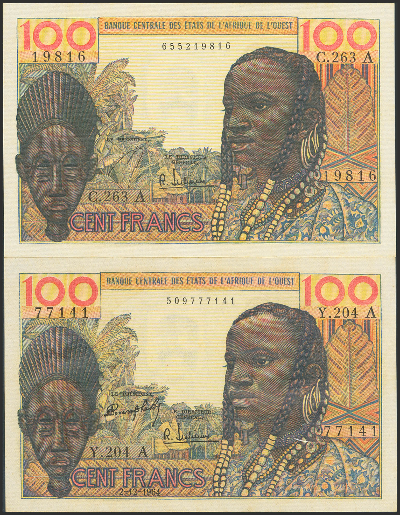 WEST AFRICAN STATES. Lot of 2 notes of 100 Francs. 2 December 1964 and not dated. Banque Centrale des Etats de l'Afrique de l'Ouest. Ivory Coast. (Pick: 101Ad, 101Ag). Less than Uncirculated.