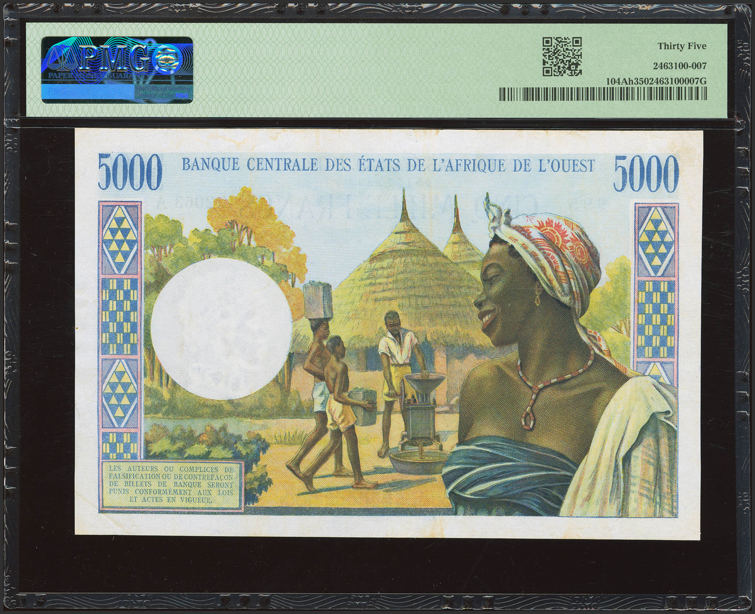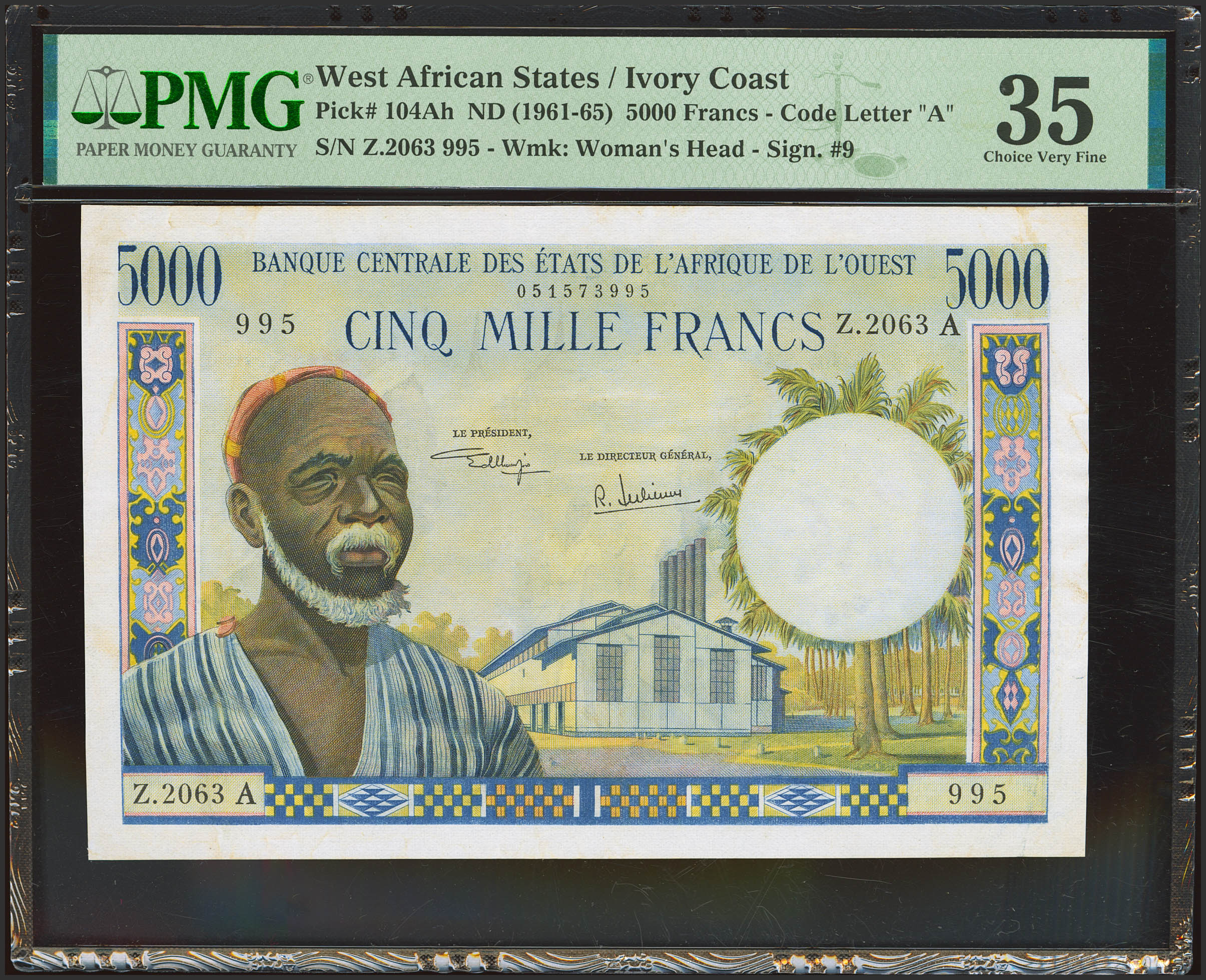 WEST AFRICAN STATES. 5000 Francs. (1960ca). Banque Centrale des Etats de l'Afrique de l'Ouest. Ivory Coast. Signatures of Edem Kojo and R. Julienne. (Pick: 104Ah). PMG35.