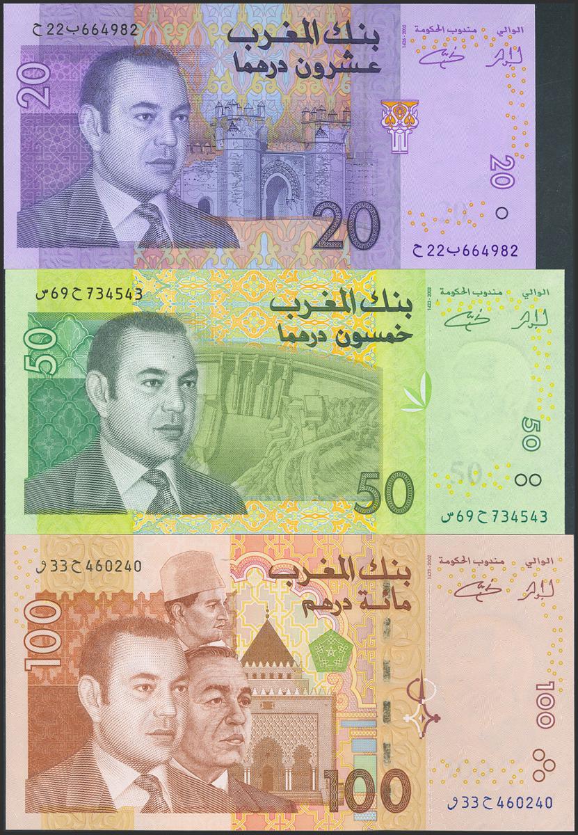 MOROCCO. Lot of 3 notes from 20 to 100 Dirhams. 2005. Bank Al-Maghrib. (Pick: 68, 69a, 70). Uncirculated.