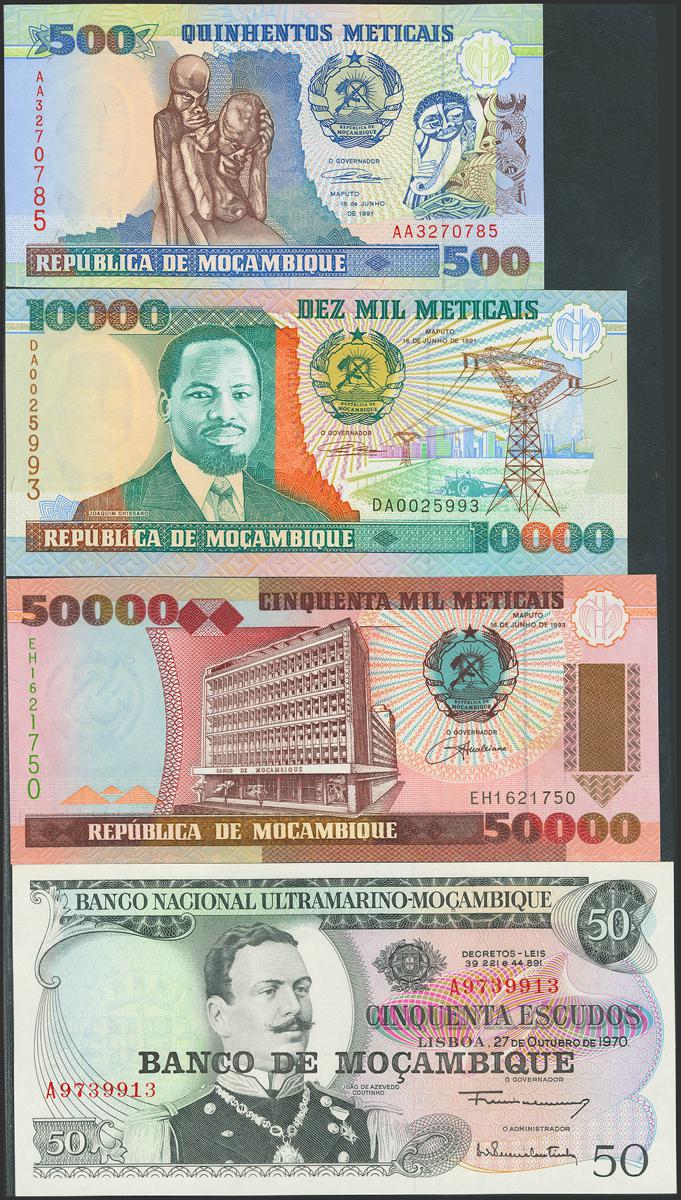 MOZAMBIQUE. Lot of 4 notes from 50 to 50000 Escudos. 1970 to 1993. Banco de Mozambique. (Pick: 116, 134, 137, 138). Uncirculated.