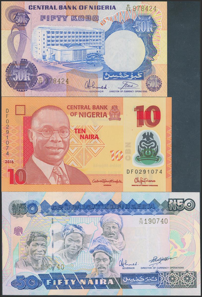 NIGERIA. Lot of 3 notes from 50 Kobo to 50 Naira. (1973ca) to 2016. Central Bank. (Pick: 14g, 27b, 39g). Uncirculated.