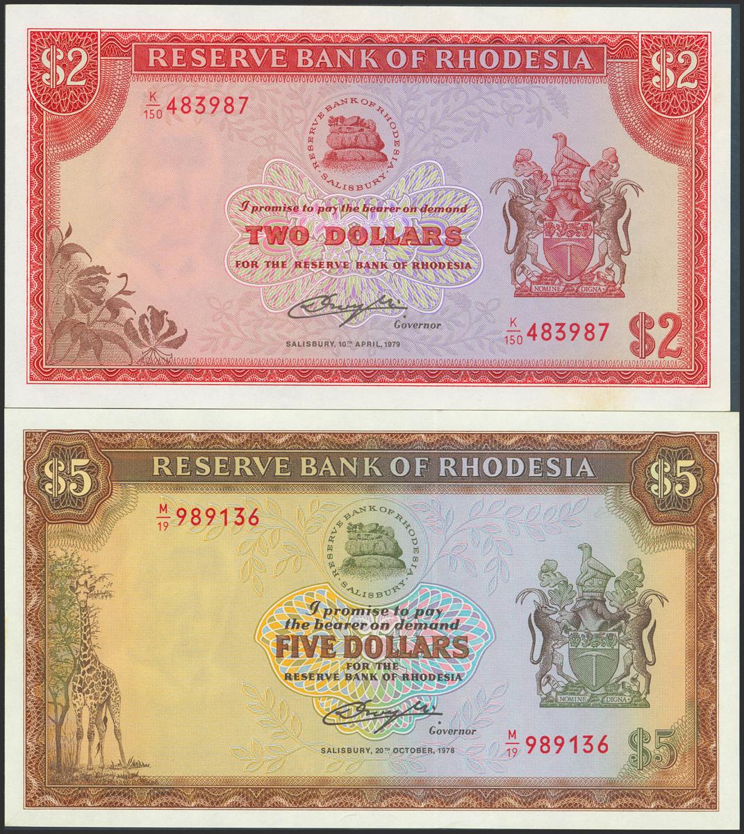 RHODESIA. Lot of 2 notes of 2 and 5 Dollars. 1978 and 1979. Reserve Bank. Watermark Cecil Rhodes. (Pick: 35d, 36b). Less than Uncirculated and Uncirculated (P36b).