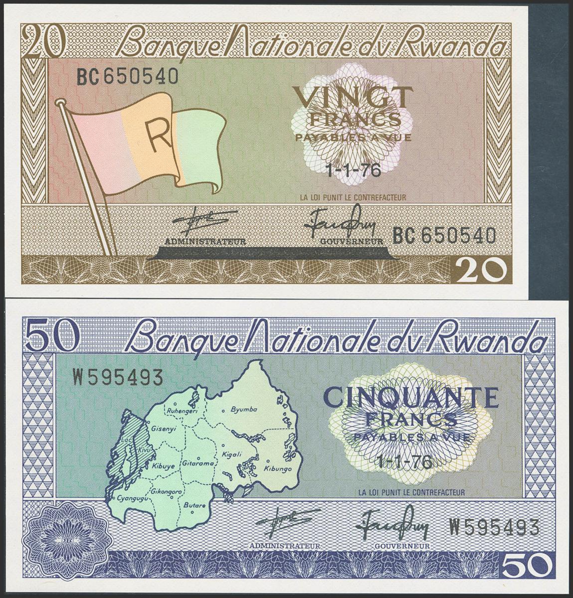 RWANDA. Lot of 2 notes of 20 and 50 Francs. 1 January 1976. Banque Nationale. (Pick: 6e, 7c). Uncirculated.