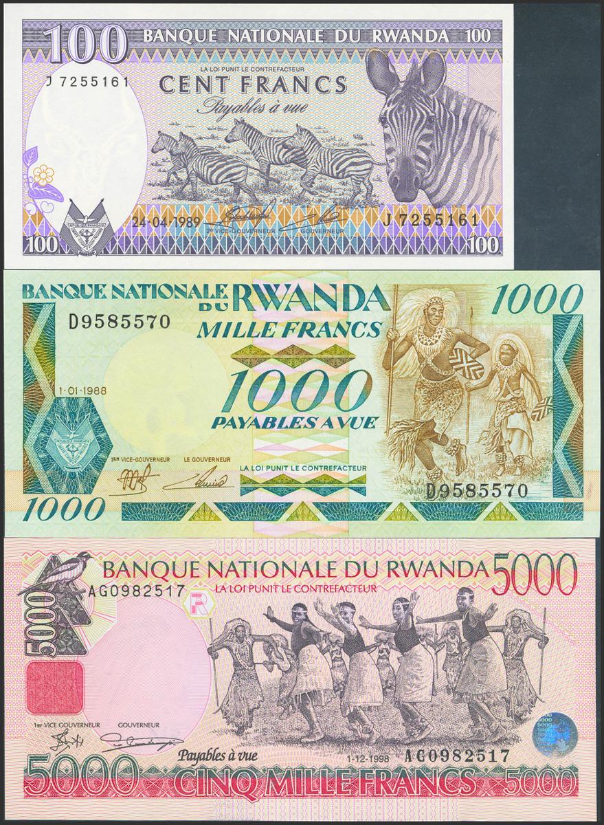 RWANDA. Lot of 3 notes of 100, 1000 and 5000 Francs. 1988 to 1998. Banque Nationale. (Pick: 19, 21a, 28a). Uncirculated.