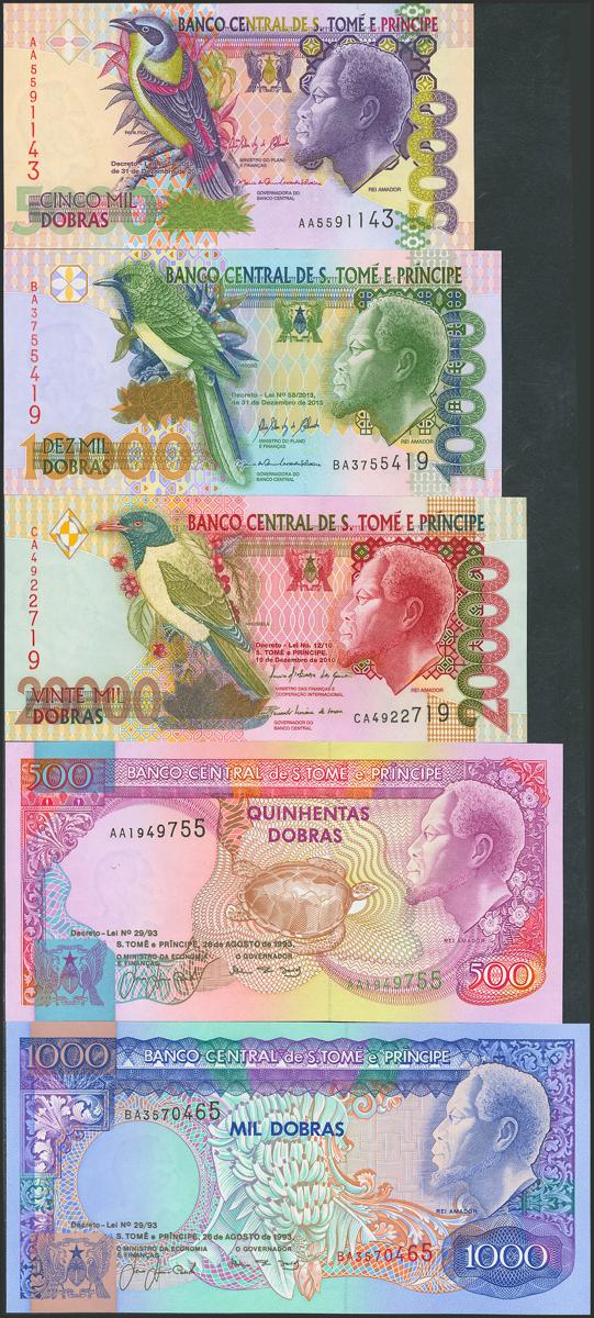 SAO TOME AND PRINCIPE. Lot of 5 notes from 500 to 20000 Dobras. 1993 to 2013. Banco Central. (Pick: 63, 64, 65d, 66d, 67d). Uncirculated.