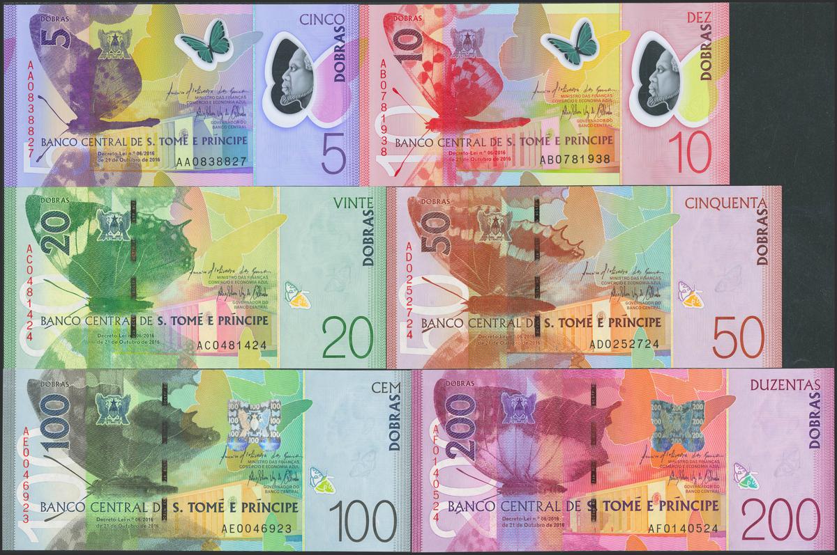 SAO TOME AND PRINCIPE. Lot of 6 notes from 5 to 200 Dobras. 2016. Banco Central. (Pick: 70, 71, 72, 73, 74, 75). Uncirculated.