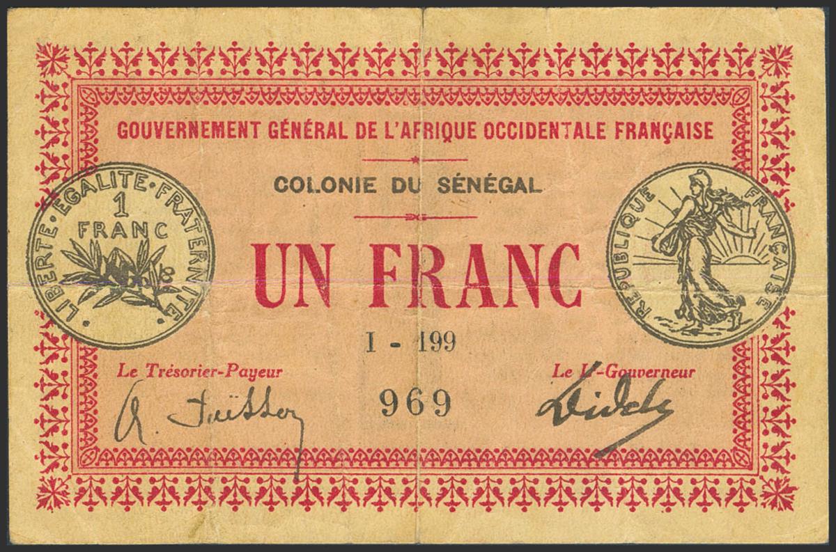 SENEGAL. 1 Franc. 11 February 1917. Gouvernement General de l'Afrique Occidentale Francaise. Colonie Du Senegal. (Pick: 2c). Tear. Very Fine.