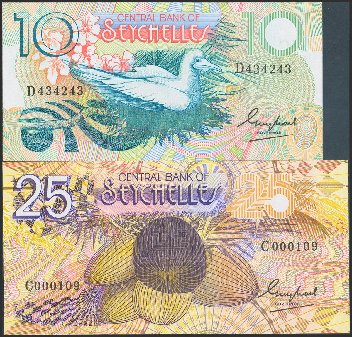 SEYCHELLES. Lot of 2 notes of 10 and 25 Rupees. (1983ca). Central Bank. One of them has a low serial number. (Pick: 28a, 29a). Uncirculated.