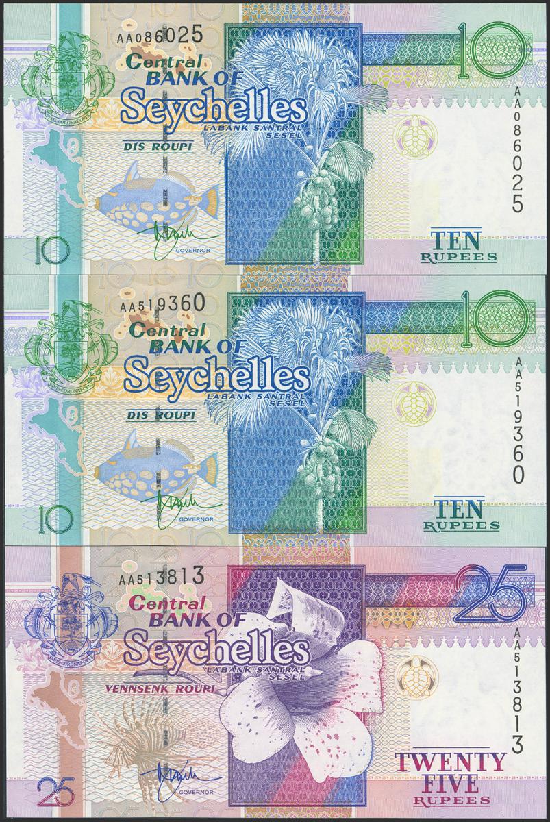 SEYCHELLES. Lot of 3 notes of 10 and 25 Rupees. (1998ca). Central Bank. Signature of Norman Weber. (Pick: 36a(2), 37a). Uncirculated.