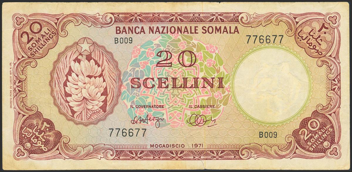 SOMALIA. 20 Shillings. 1971. Banca Nazionale. Radar serial number. (Pick: 15a). Tear. Very Fine.