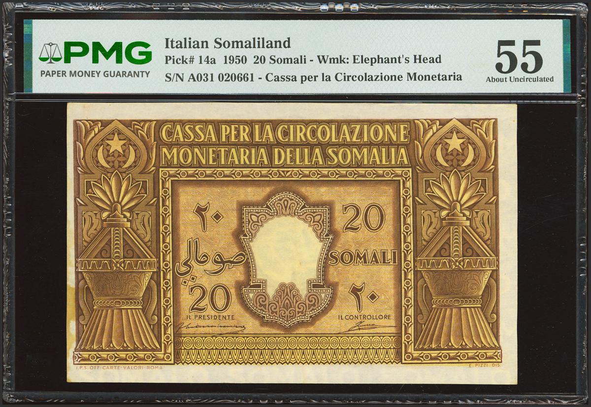 SOMALILAND ITALIAN. 20 Somali. 1950. Cassa per la Circolazione Monetaria della Somalia. Ciancimino and Inserra Signatures. (Pick: 14a). PMG55 (minor stains).