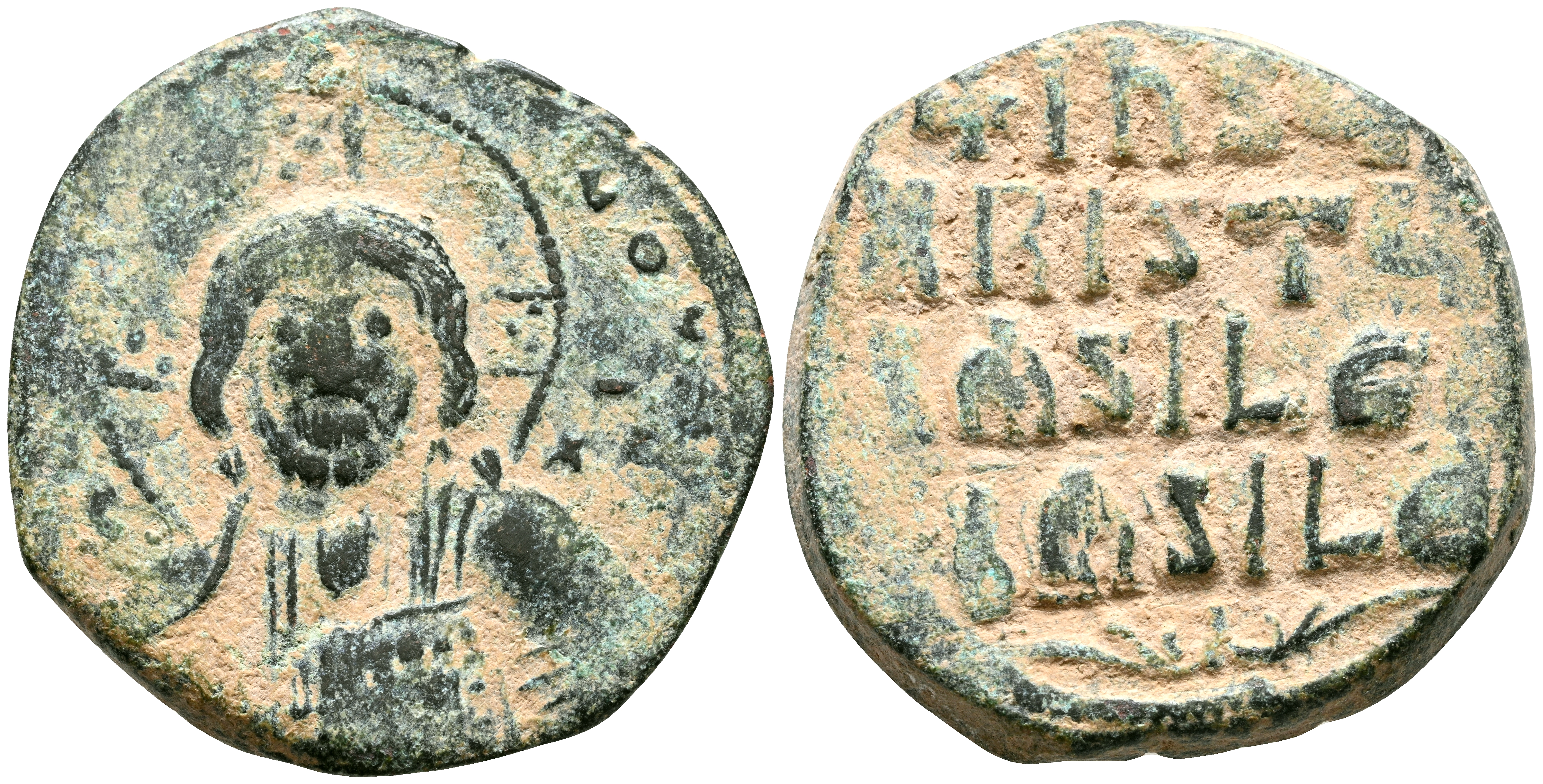 ANONIMO, tiempos de Basilio II y Constantino VIII. Follis. (Ae. 8,19g/27mm). 976-1025 d.C. Constantinopla. (Seaby 1813). Anv: Busto de Cristo de frente sosteniendo Evangelio, en campo: IC-XC, alrededor: EMMA-NOVHΛ. Rev: IhSϤS / XRISTϤS / bASILЄϤ / bA SILЄ. MBC.