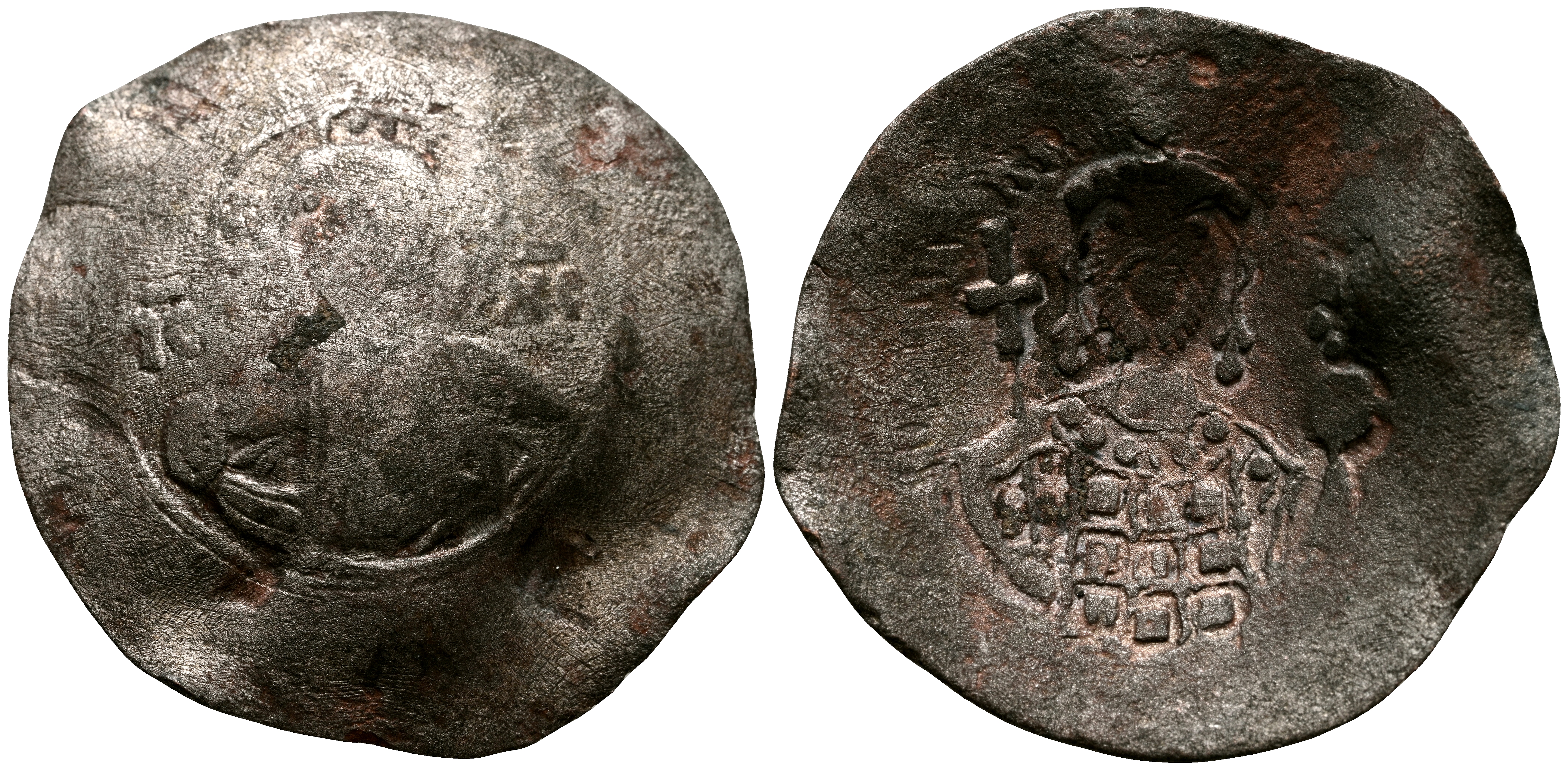 ALEJO I. Aspron Trachy (Ve. 2,80g/27mm). 1081-1118 d.C. Constantinopla. (DOC 25; Seaby 1918). Anv: Cristo nimbado y entronizado, levantando la mano derecha en bendición y sosteniendo Evangelios entre: IC-XC. Rev: Busto coronado de Alejo I de frente, sosteniendo cetro cruciforme en la mano derecha y el globo crucífero en la izquierda, alrededor: ΛΛE ΔE. BC+/MBC-.