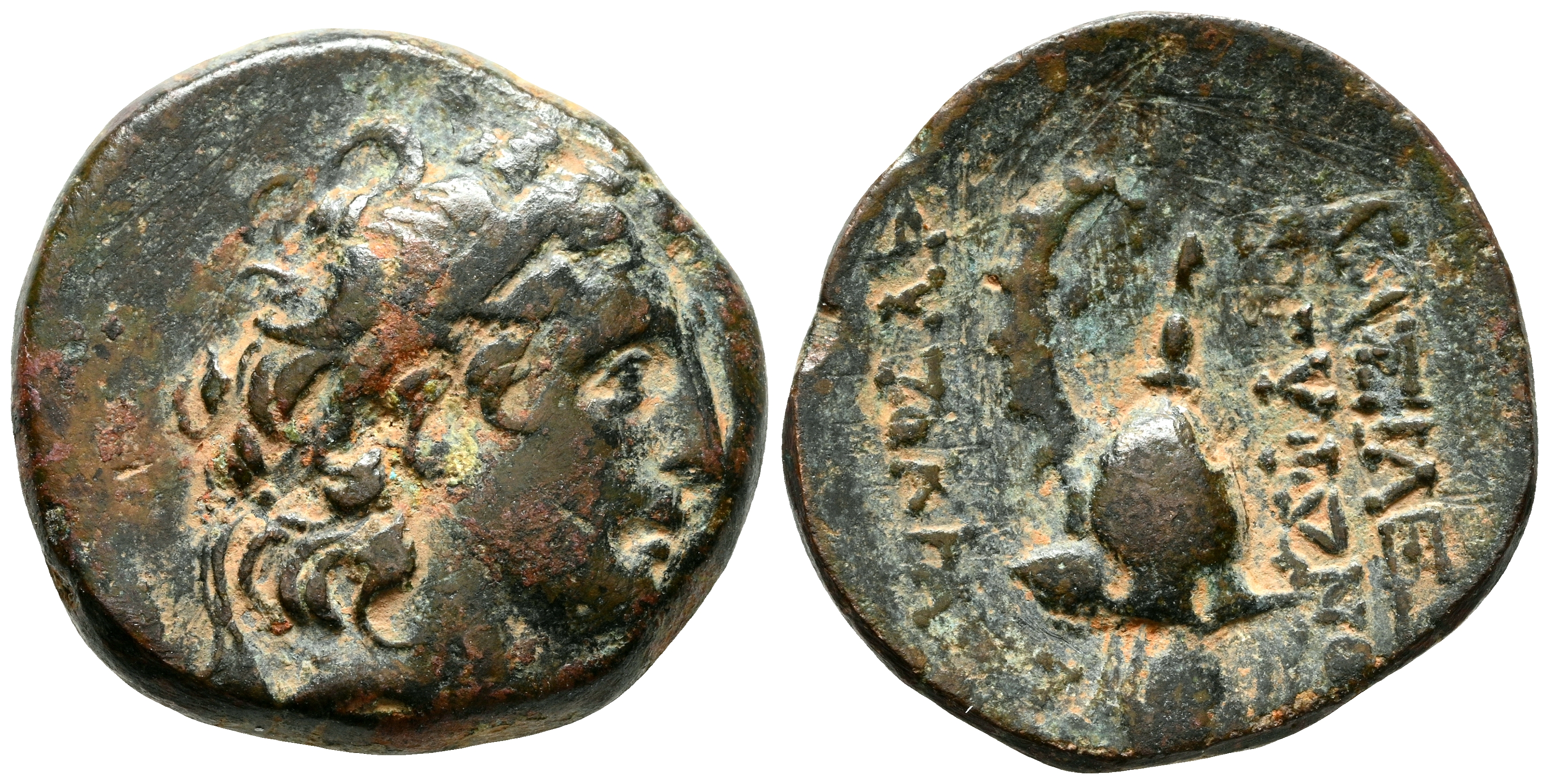 REINO SELEUCIDA, Tryphon. Ae18. (Ae. 4,23g/17mm). 142-138 a.C. Antioquía en Orontes. (Seaby 2034.1; HGC 9, 1061). Anv: Cabeza diademada a derecha. Rev: Casco macedonio con cuernos de cabra, alrededor leyenda: BAΣIΛEΩΣ TPYΦΩNOΣ AYTOKPATOPOΣ. MBC-.