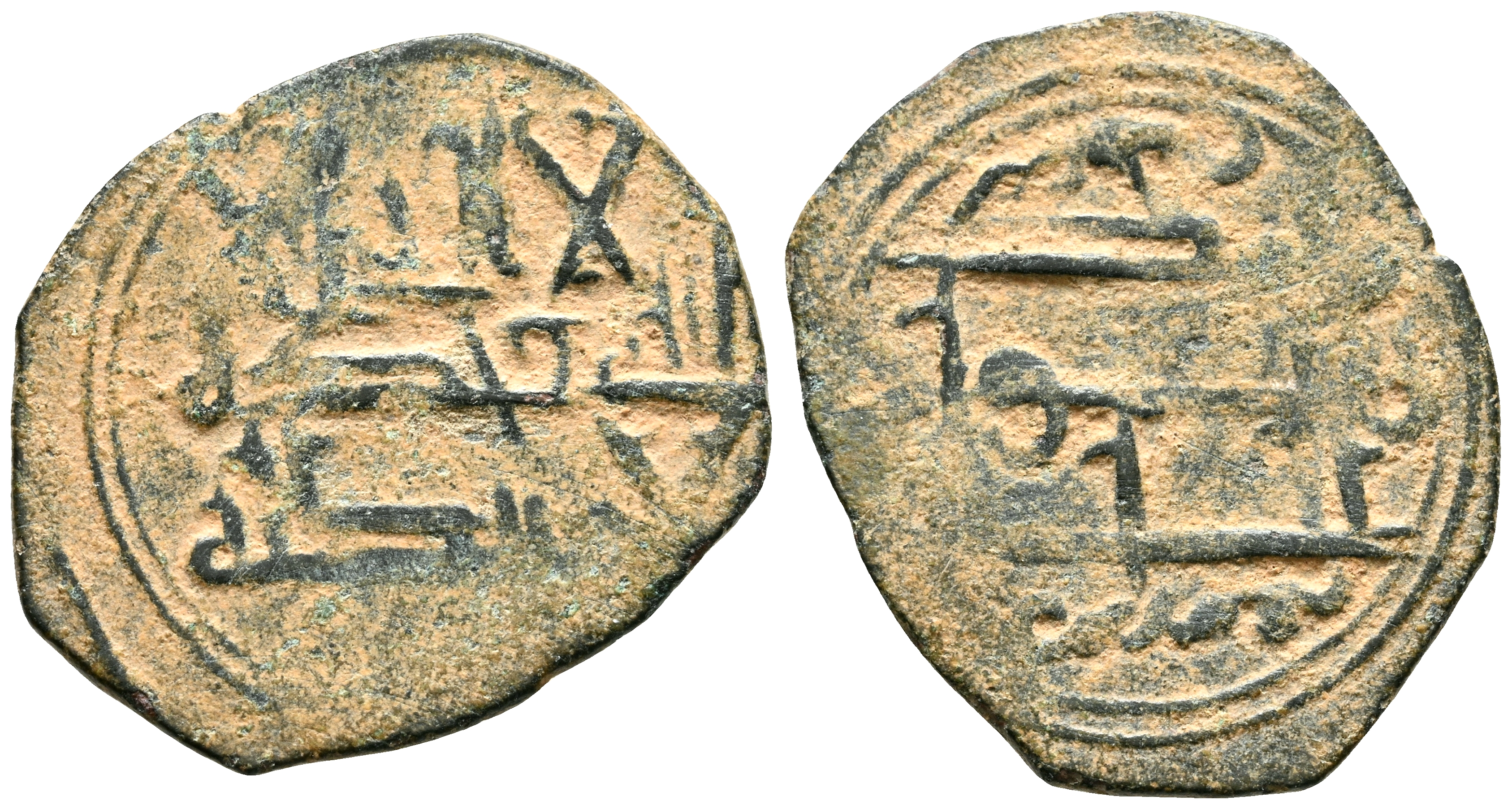 EMIRATO INDEPENDIENTE DE CORDOBA, Anónimo, atribuído a Muhammad l. Felus. (Ae. 1,24g/19mm). S/D. (Vives 320; Frochoso l-50). Tres líneas de leyenda religiosa en ambas áreas. Rev: لله (para Dios)/ وله (y para El). MBC.