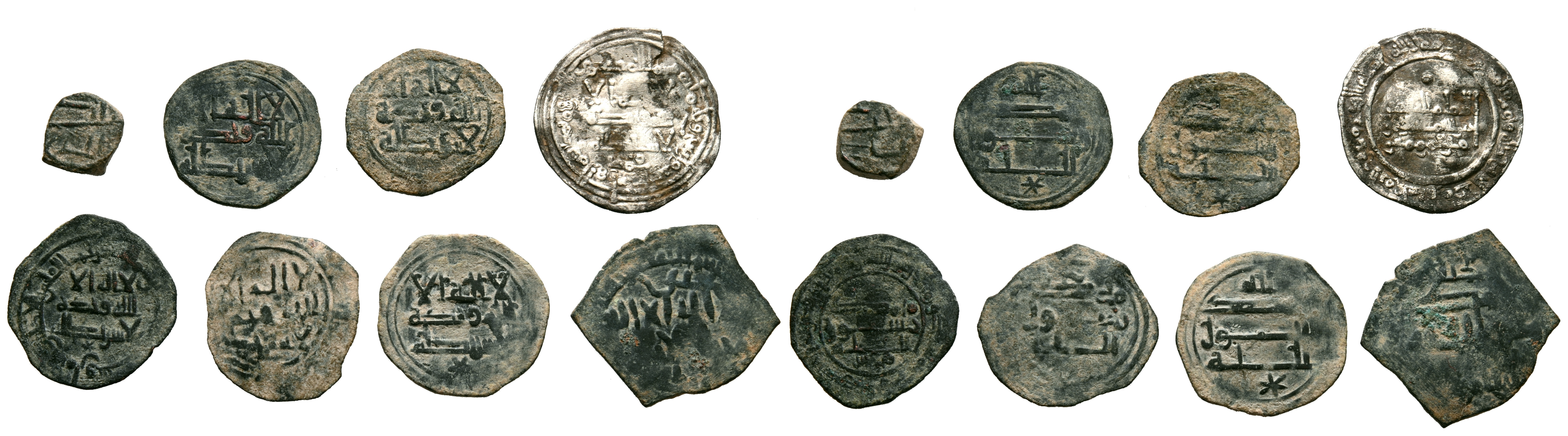 EMIRATO DEPENDIENTE y CALIFATO DE CÓRDOBA. Interesante conjunto formado por 8 acuñaciones variadas. Destacan los bonitos féluses de época de Muhammad I, uno de ellos con ceca y fecha, así como un raro felús del los primeros años de Abd al-Rahman III, citando a Yahya. Inlcuye un dirham del año 346H con ceca Madinat al-Zahra /مدينة الزهرا. Diferentes medidas y estados de conservación. A EXAMINAR.