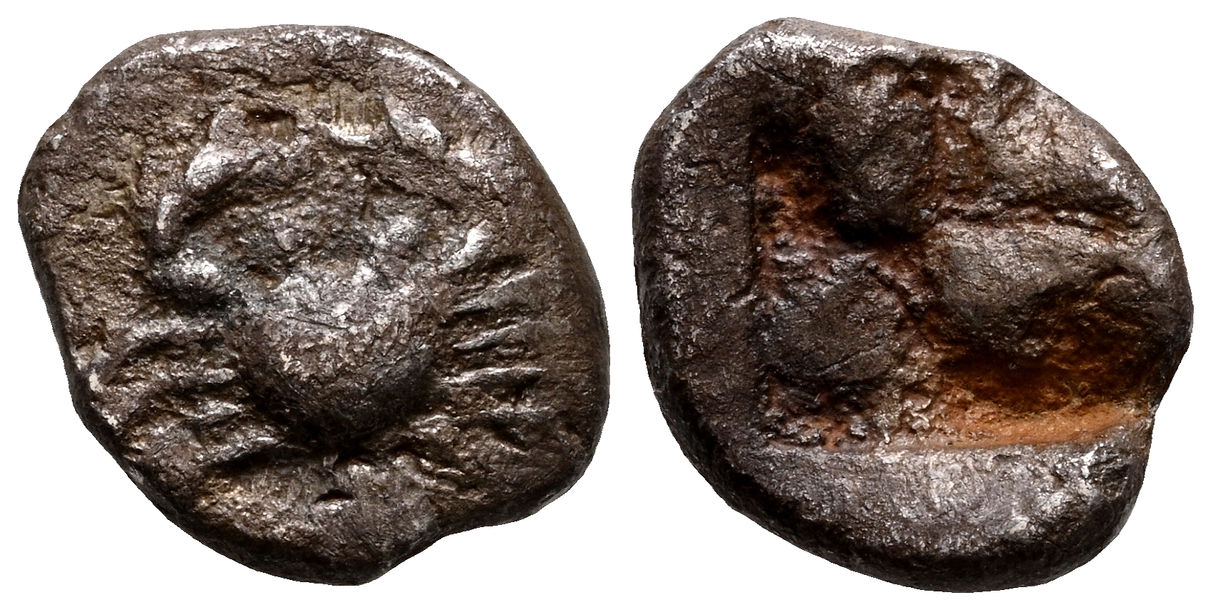 CARIA, Kos. Obolo. (Ar. 0,52g/9mm). 500-480 a.C. (HGC 6, 1297; SNG Kayhan 903). Anv: Cangrejo. Rev: Cuatripartito incuso. MBC-. Ex Nomos, Web Auction 40 (14/12/2025), Nº Lote 502.