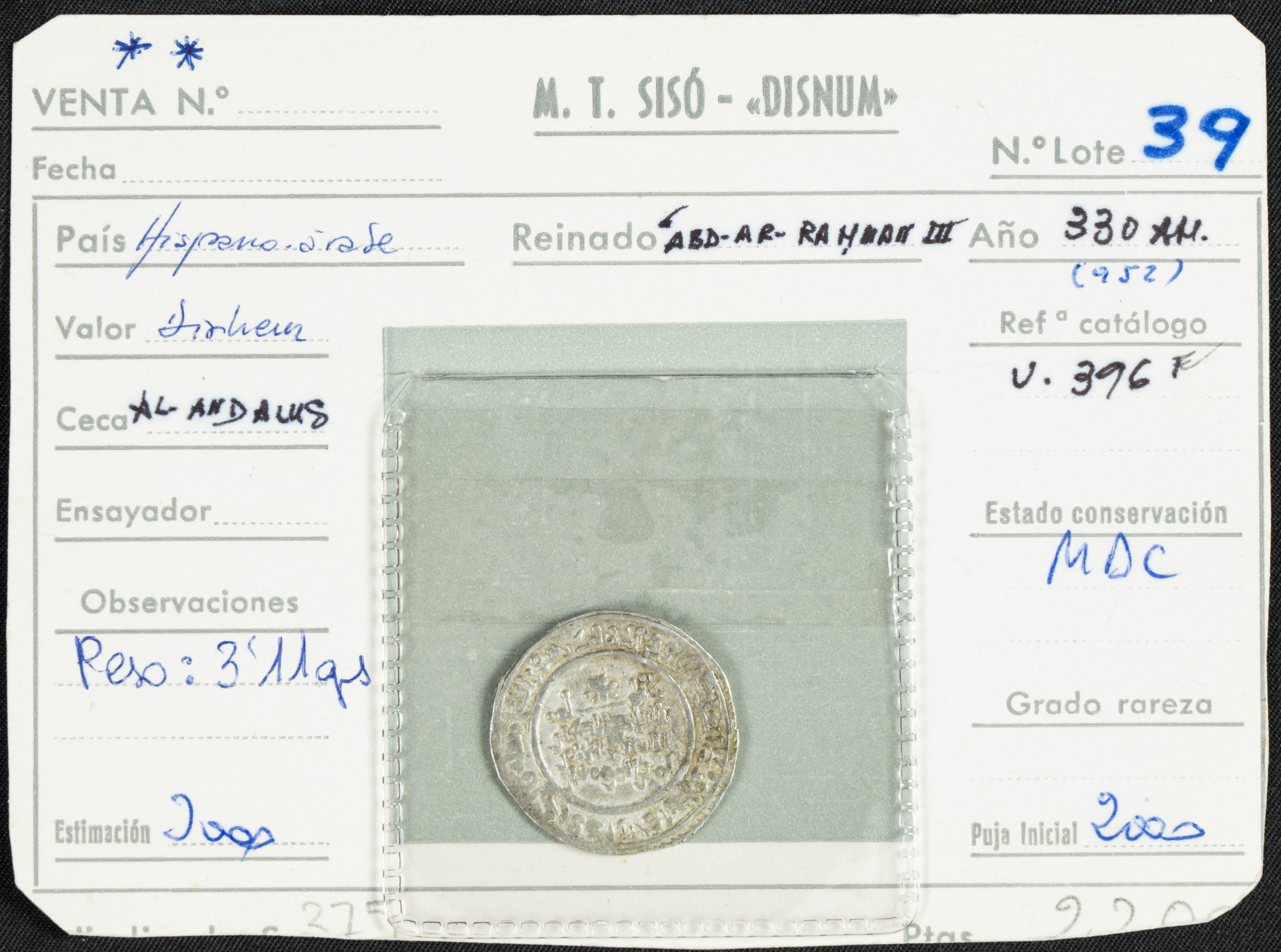 CALIFATO DE CÓRDOBA. 'Abd al-Rahman III. Dirham. (Ar. 3,13g/24mm). 330H. al-Ándalus / الاندلس. (Vives 396; Frochoso 330.8). Citando a Qāsim / قاسم en IA. MBC. Incluye ficha original de M. T. Sisó Disnum.