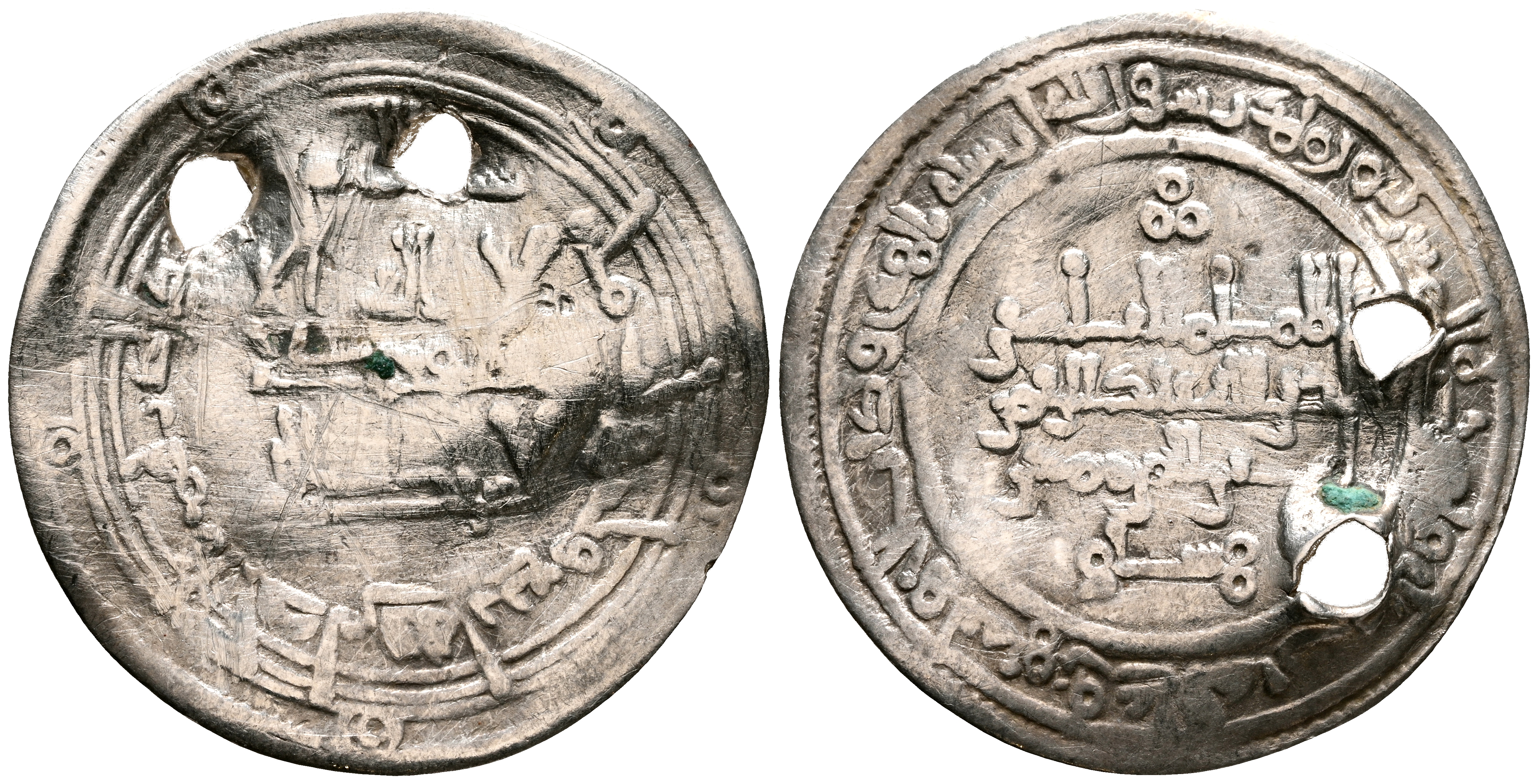 CALIFATO DE CORDOBA, 'Abd al-Rahman III. Dirham. (Ar. 2,13g/24mm). 334H. al-Ándalus / الاندلس. (Vives 407; Frochoso 334.10). Citando a Hisam / حشام en IIA. MBC-. Dos perforaciones.