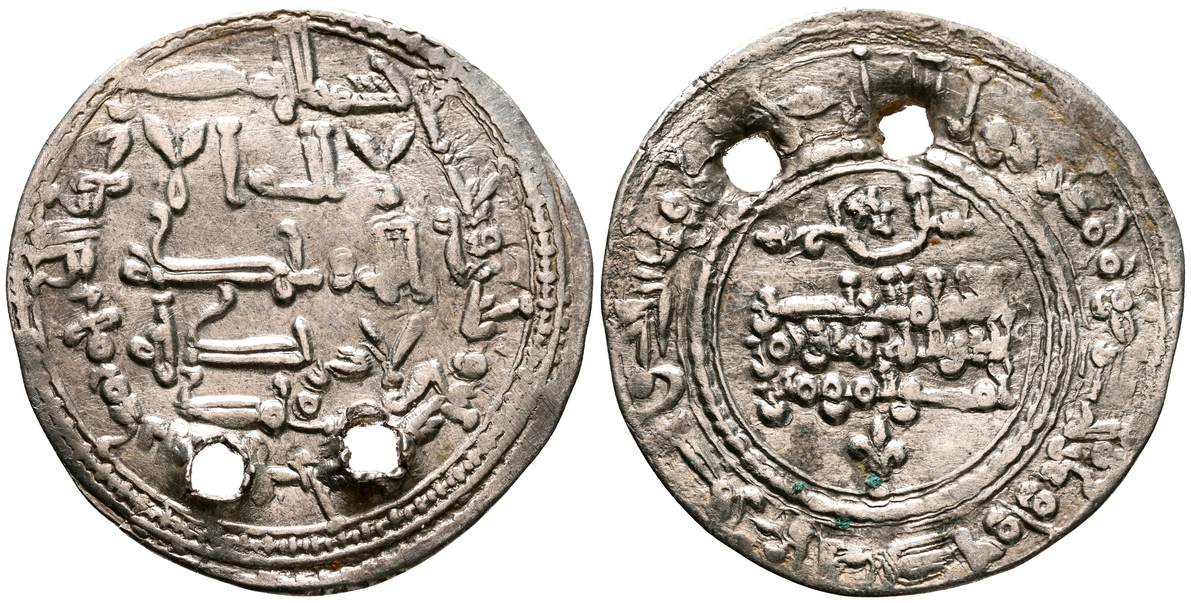 CALIFATO DE CORDOBA, 'Abd al-Rahman III. Dirham. (Ar. 2,78g/26mm). 337H. Madinat al-Zahra / مدينة الزهرا. (Vives 417; Frochoso 337.83). Citando a Muhammad / محمد en IA. MBC-. Dos perforaciones.