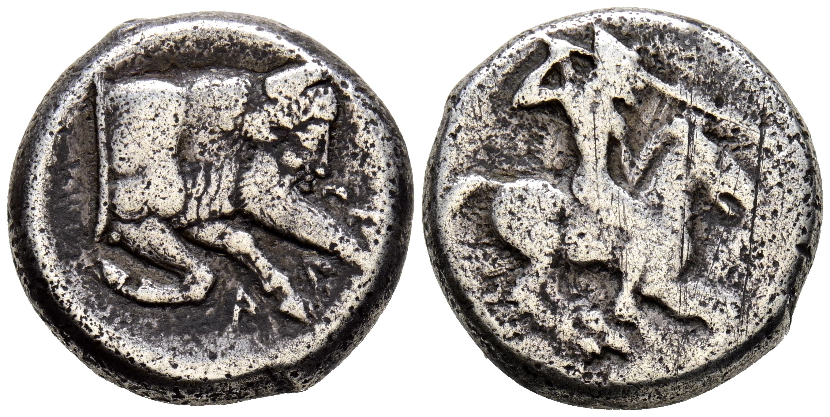SICILIA, Gela. Didracma. (Ar. 8,37g/19mm). 480 a.C. (SNG ANS 4; SNG Lloyd 956). Anv: Jinete con lanza a derecha. Rev: Parte delantera de toro con cabeza del dios Gelas, delante leyenda: CΕ-Λ-Α. MBC-. Plata porosa.