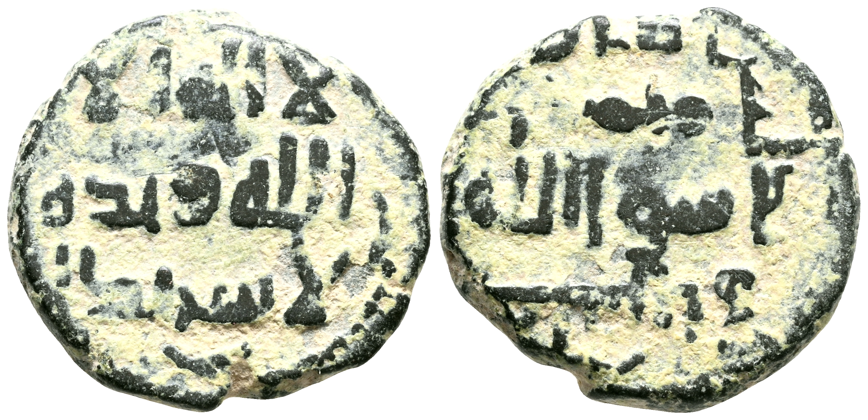 EMIRATO DEPENDIENTE DE CÓRDOBA, PERIODO DE GOBERNADORES. Anónimo. Felús. (Ae. 2,48g/12mm). S/D. al-Ándalus / الاندلس. (Frochoso XVIII-a). Anv: 'Sahada' en tres líneas. Rev: سول الله / محمدر, alrededor de orla cuadrada: ضرب هذا الفلس الاندلس. MBC+. Es caso.