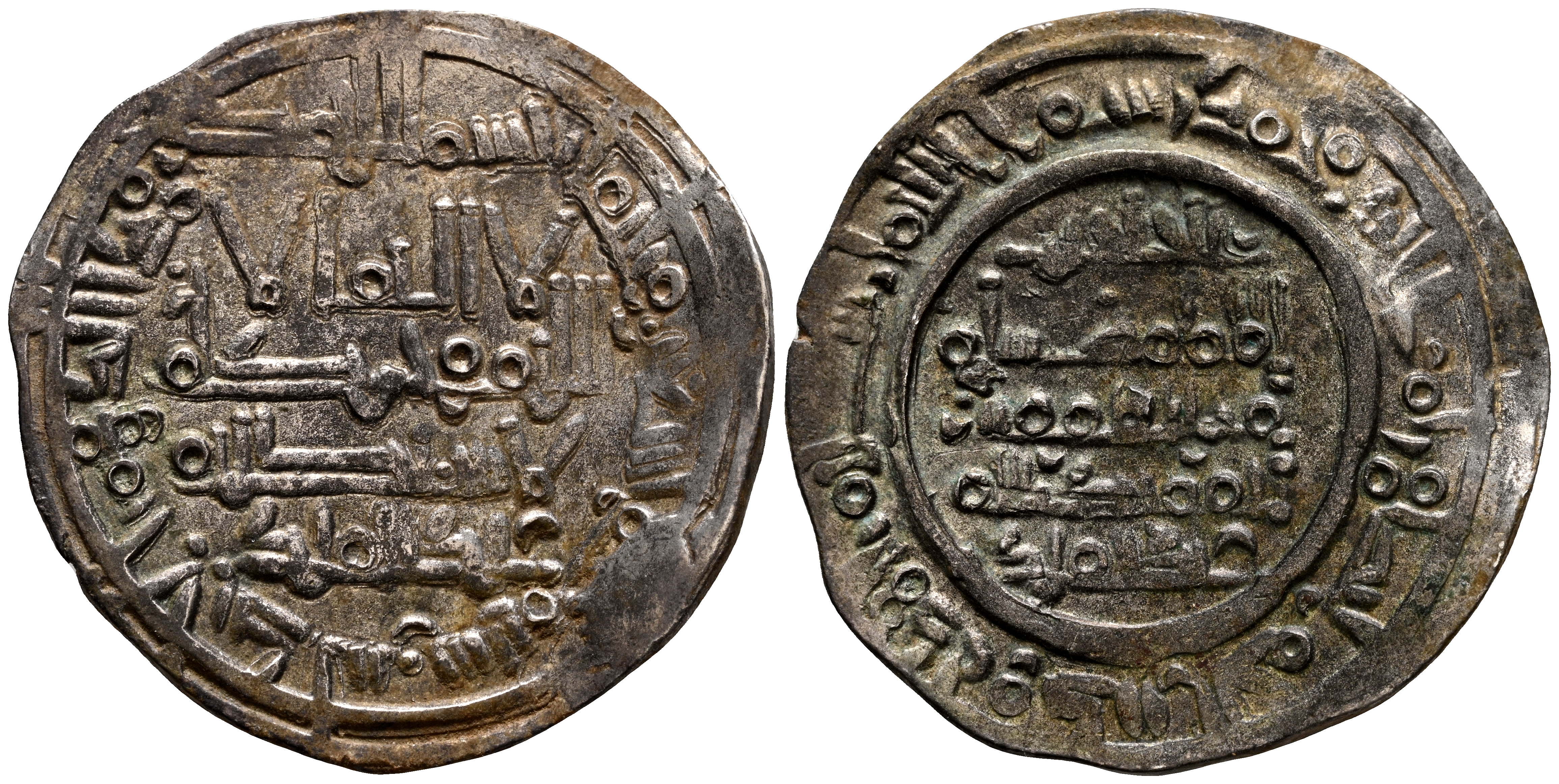 CALIFATO DE CORDOBA, Hisham II. Dirham. (Ar. 3,40g/24mm). 393H. al-Ándalus / الاندلس. (Vives 577; Frochoso 393.15). Citando a 'Abd al-Malik / عبد الملك en IA. y al-Hāŷib 'Abd al-Malik / عبد الملك / الحاجب en IIA. MBC+. Alabeada.