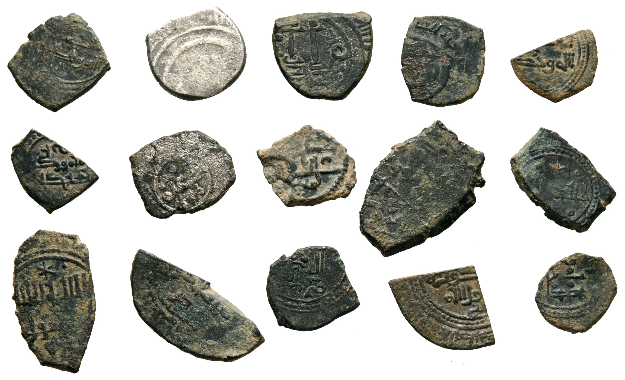 TAIFAS DEL CALIFATO. Extraordinario conjunto formado por 15 fragmentos de dírhams y handúes muy variados correspondientes a las Taifas de Códoba, Badajoz, Toledo-Valencia y Almería. Diferentes módulos, medidas y estados de conservación. A EXAMINAR.