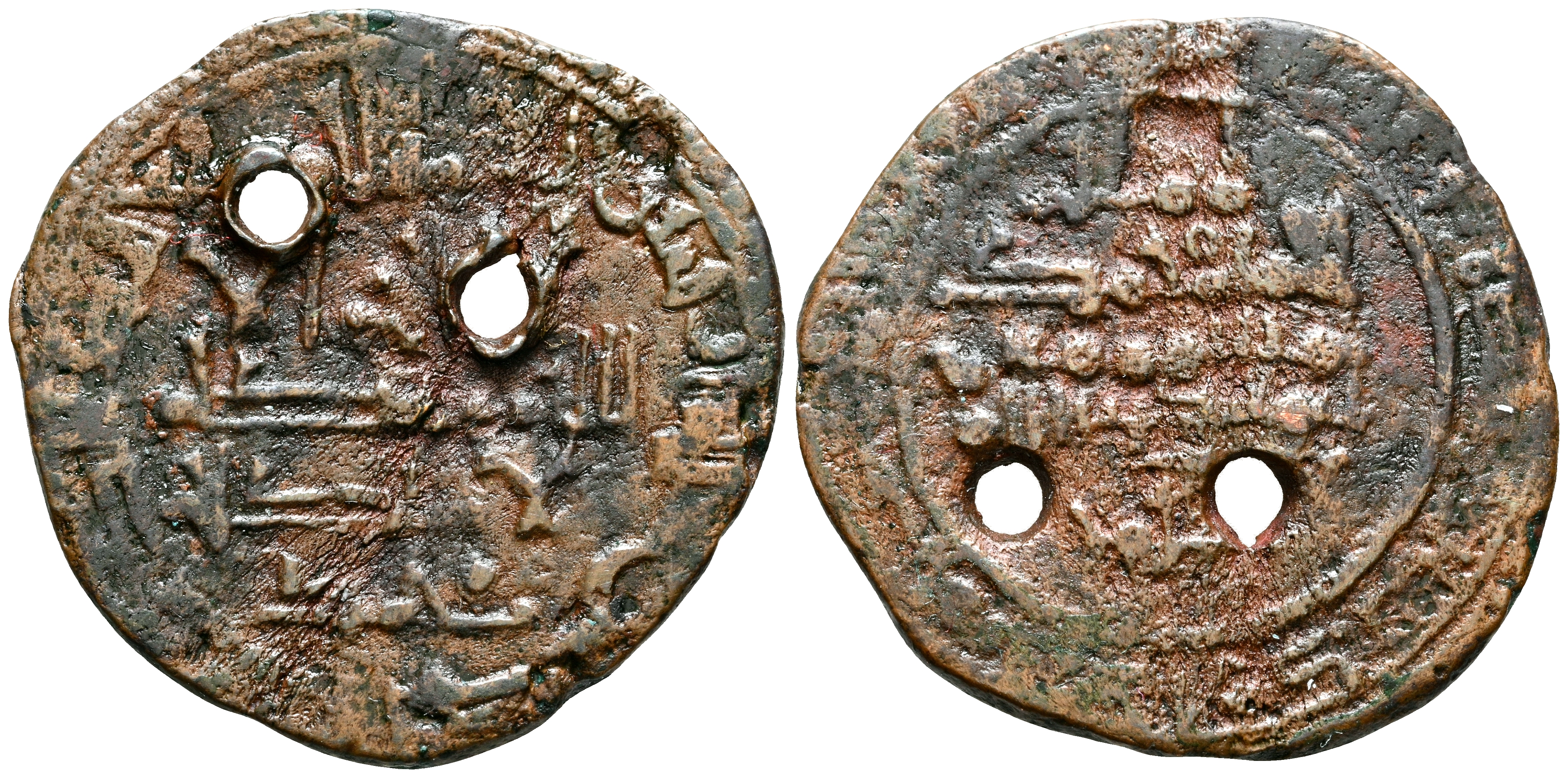 TAIFAS DEL CALIFATO, MÁLAGA (Hammudies). Muhammad Ibn Idris, Al-Mahdi. Dirham. (Ve. 3,24g/23mm). 440H. al-Ándalus / الاندلس. (Vives 859; Prieto 104a; Ariza Mu4.1). Citando a محمد (Muhammad) en AI. y al يحيى /الامار (al-'Āmir Yahyā) en IIA. MBC-. Dos perforaciones. Incluye etiqueta con anotaciones y dibujos de época del antiguo coleccionista.