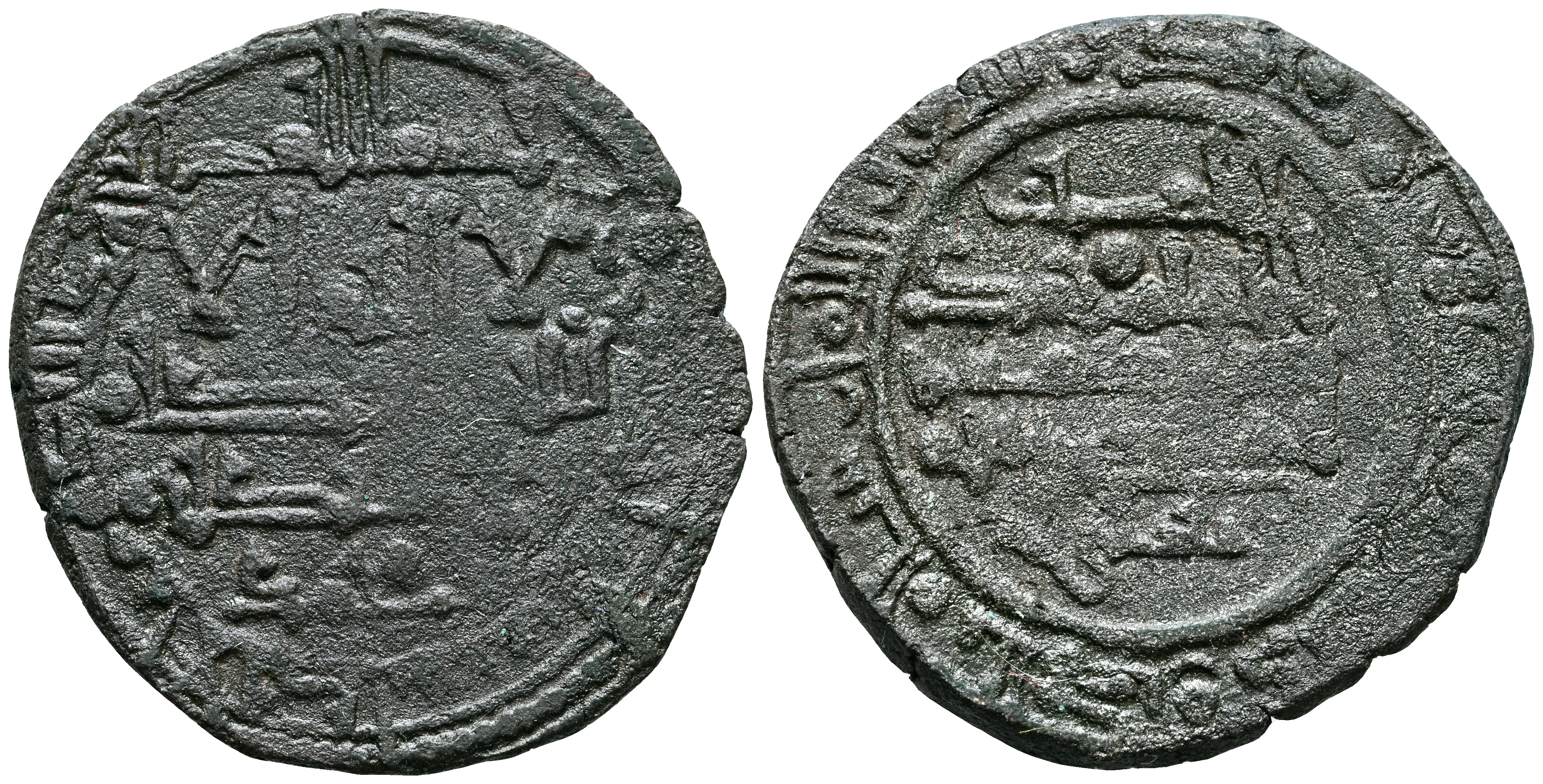 TAIFAS DEL CALIFATO, MÁLAGA (Hammudies). Muhammad Ibn Idris, Al-Mahdi. Dirham. (Ve. 3,66g/23mm). 441H. al-Ándalus / الاندلس. (Vives 861; Prieto 104b; Ariza Mu4.4). Citando a محمد (Muhammad) en AI. y al يحيى /الامار (al-'Āmir Yahyā) en IIA. MBC. Vanos de acuñación. Incluye etiqueta con anotaciones y dibujos de época del antiguo coleccionista.
