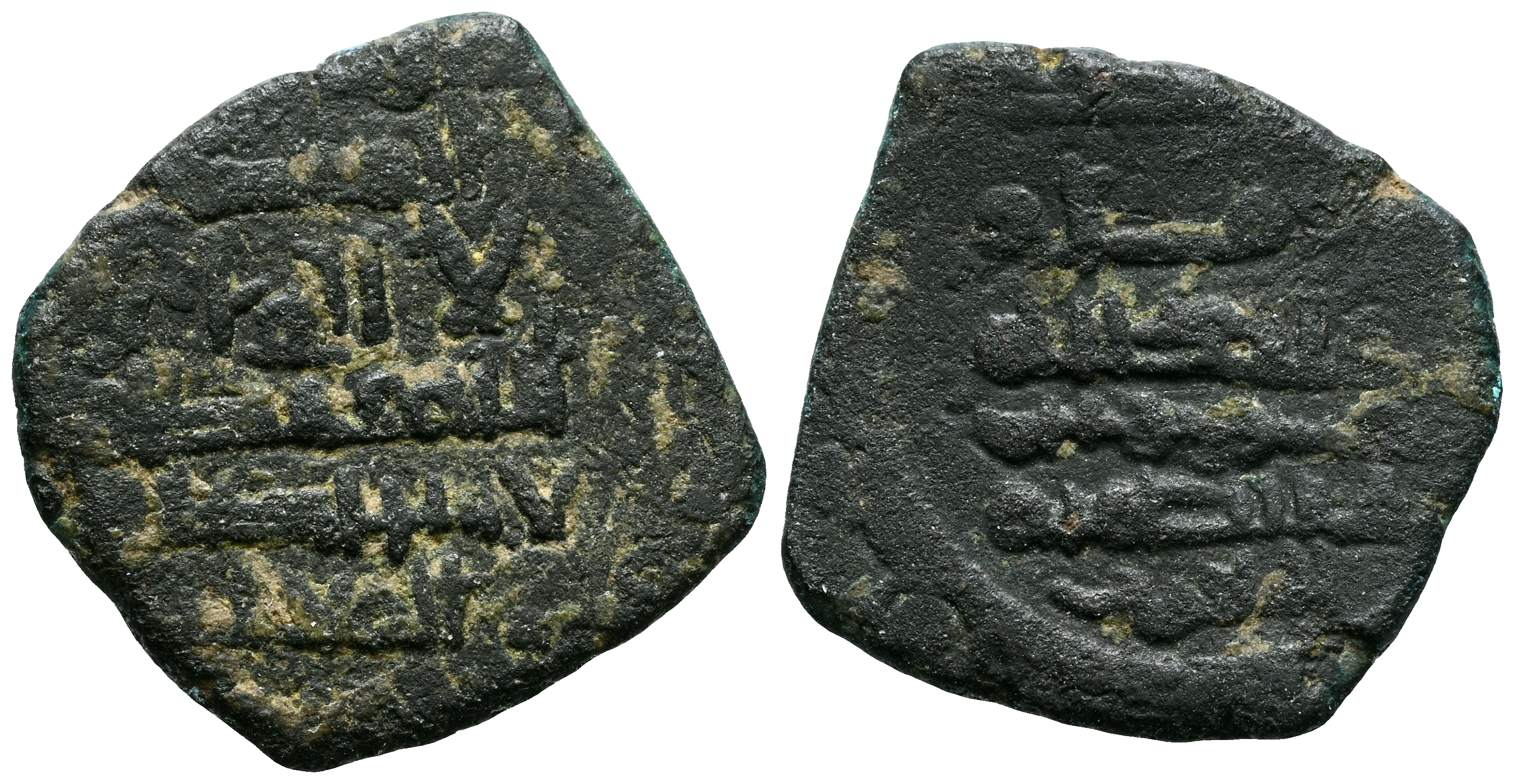 TAIFAS DEL CALIFATO, CEUTA. Saqqwut Al-Barghawati. Fracción de Dirham. (Ar. 1,55g/17mm). 464-467H. Medina Sabta (Ceuta) / مدينة سبتة. (Vives 877-880). Fecha y ceca no visible. Citando a: سقوت / المعان / المنصور (al-Mansūr/al-Mu'ān/Suqūt) en IA y العز / بها ، الدولة / الحاجب (al-hā yib/Bahā al-Dawla/al-'Izz) en IIA. MBC-. Raro ejemplar. Incluye etiqueta con anotaciones y dibujos de época del antiguo coleccionista.